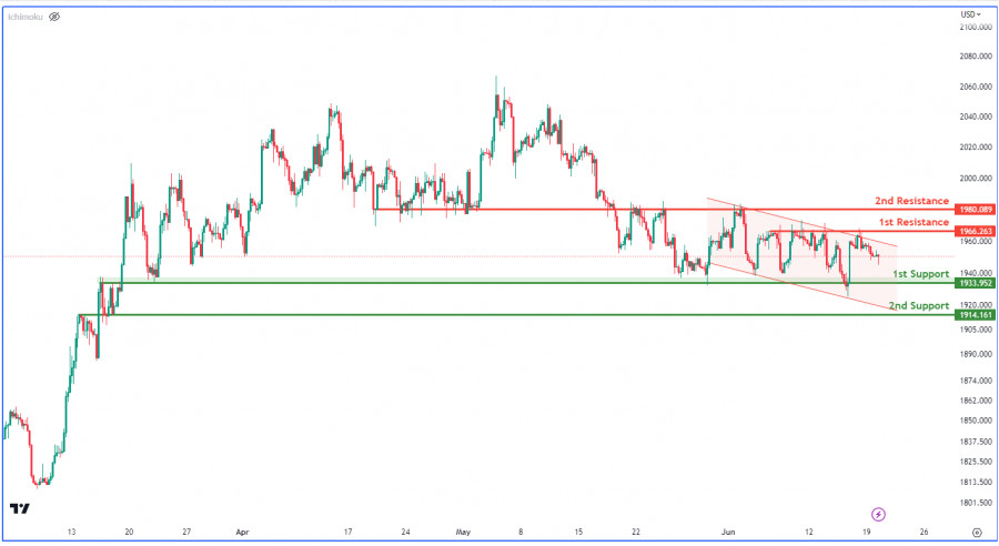 График пары XAU/USD указывает на наличие нисходящего импульса. О медвежьем рынке свидетельствует движение цены в рамках нисходящего канала. Ожидается, что снижение продолжится к первому уровню поддержки 1 933,95, который выступает в роли поддержки с перекрытием. Второй уровень поддержки 1 914,16 еще больше усиливает вероятность продолжения медвежьего сценария. Первый уровень сопротивления 1 966,26 не раз являлся локальным максимумом, а второй уровень сопротивления 1 980,08 выступает в роли сопротивления с перекрытием.