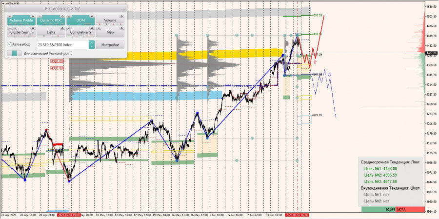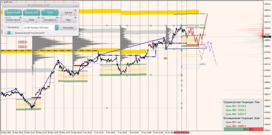 Альтернативный сценарий: при закреплении котировок индекса SNP500 ниже зоны 1/2 (4329.89) при откатах искать продажи по паттерну в новом диапазоне выгодных цен, с целями: обновление минимумов и тестирование верхней границы НКЗ (4229.09). NASDAQ – среднесрочный лонг Долгосрочная тенденция: в лонг. Максимальное скопление объемов текущего контракта расположено в диапазоне, по котировкам 14800.0-15000.0. В настоящий момент по Nasdaq совершаются инвестиционные операции выше, указывая на силу покупателей. Среднесрочная тенденция: в лонг. Максимальное скопление объемов среднесрочной тенденции расположено в диапазоне, по котировкам14850.0-14950.0. В настоящий момент по Nasdaq совершаются инвестиционные операции выше, указывая на силу покупателей. Область выгодных цен на покупку с точки зрения маржинального обеспечения, располагается между зонами 1/4 и 1/2 построенными от максимума 16.06.2023. Котировка верхней границы зоны 1/4 - 15100.0. Котировка верхней границы зоны 1/2 – 14890.0. Внутридневные цели: обновление максимумов от 16.06.2023- 15310.0. Среднесрочные цели: тест нижней границы ЗНКЗ – 15552.5. Инвестиционный прогноз: покупки из диапазона выгодных цен при формировании разворотного паттерна. Buy: 14890.0-15100.0, Take Profit 1-15310.0, Take Profit 2-15552.5.