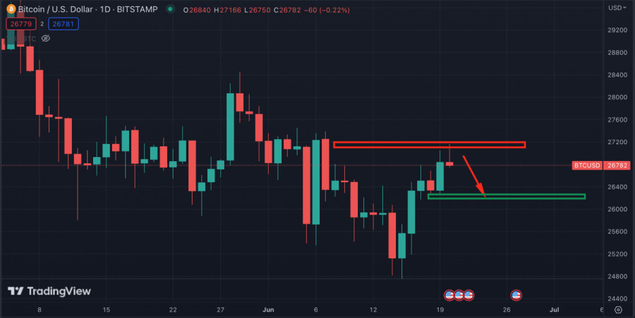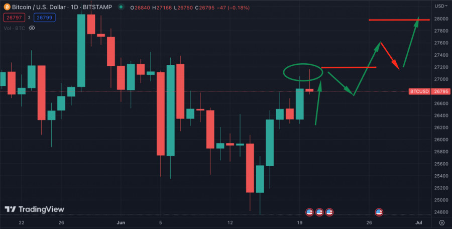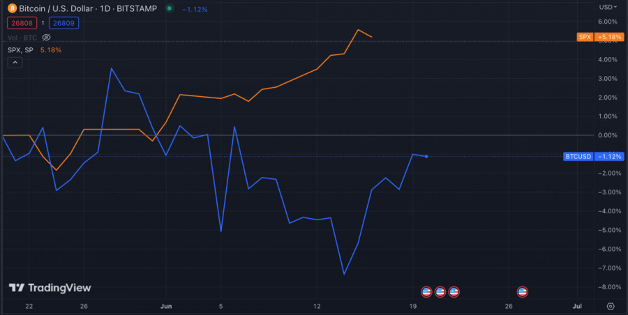 Биткоин совершает бычий рывок к $27k: цель достигнута?ИнстаФорекс - Instaforex, 2 года назад Затишье на мировых финансовых рынках в связи с банковским выходным в США позволило сделать несколько важных выводов. Биткоин по-прежнему находится в рамках нисходящего тренда, несмотря на успешное закрепление выше $26k. Ближайшие дни покажут можно ли считать это ценовое движение попыткой совершить разворот тренда или восходящей коррекцией. В ближайшие дни волатильность вернется на крипто рынок, и открытие американской торговой сессии сегодня в 14:30 станет первым импульсом. За последние несколько дней появилось достаточно положительных сведений, которые могут сподвигнуть BTC на очередной восходящий рывок. Корреляция BTC и SPXБиткоин начал утрачивать корреляцию с фондовым индексом SPX еще в начале мая. По мере нарастания медвежьих настроений на крипто рынке созависимость финансовых инструментов продолжила снижаться. Ситуация усугубилась, когда индекс S&P 500 возобновил восходящее движение и обновил ценовой максимум. Корреляция криптовалюты и фондового индекса укрепляется, однако нельзя утверждать, что Биткоин будет вторить ценовому движению SPX. В то время как BofA утверждает, что S&P 500 сильно перекуплен, объемы торгов BTC едва достигают $10 миллиардов. По сути очередной этап бычьего тренда фондового рынка усугубил медвежьи настроения на крипто рынке. 9-недельный отток инвестиций из крипто фондов и продуктов тому прямое подтверждение. В результате мы стали свидетелями оттока ликвидности и трейдеров из крипто рынка на фондовый маркет. Индекс SPX обновил локальный максимум, а Биткоин оказался на краю пропасти и разрушения локального восходящего тренда. Биткоин скорее жив, чем мертв?Несмотря на медвежьи настроения и низкую торговую активность, инвесторы проявляют повышенный интерес к Биткоину и другим криптовалютам. Однако в отличие от апреля, упор вновь делается на долгосрочное хранение за пределами биржи. Glassnode отмечает, что отток монет BTC на крипто биржи перевесил приток. Также процент монет BTC с последней активностью более 3 лет назад составляет колоссальные 40% от общего предложения. Это касается Биткоинов, которые хранятся на холодном кошельке у долгосрочных инвесторов. Такой подход сохраняет фундаментальную ценность актива, но существенно вредит восходящему движению здесь и сейчас. Анализ BTCUSDНесмотря на все перипетии Биткоину удалось восстановиться выше $26k, и по состоянию на 11:00 актив торгуется вблизи $26,8k. Криптовалюте удалось достичь такого успеха благодаря бычьему импульсу по итогам 19 июня. Впоследствии быки усилили давление и довели цену до $27,2k, где проходит верхняя граница фигуры 6h таймфрейма "бычий треугольник". Впоследствии продавцам удалось перехватить инициативу, и цена снижалась до уровня $26,8k, где падение остановилось. Из событий последних 24 часов можно сделать вывод, что мы наблюдали восходящее движение BTC на растущих объемах. Биткоину удалось совершить пробой зоны сопротивления $26,8k, и если актив удержится выше данного уровня, то быкам открывается путь на $27k-$27,5k. ИтогиКлючевой целью для быков по итогам текущего торгового дня станет удержание и закрепление выше уровня $26,8k. При успешном выполнении этой задачи перед BTC открывается путь к $27,5k, и далее на $28k. Мы наблюдали всплеск объемов на рынке, и если эта тенденция продолжится, то Bitc
