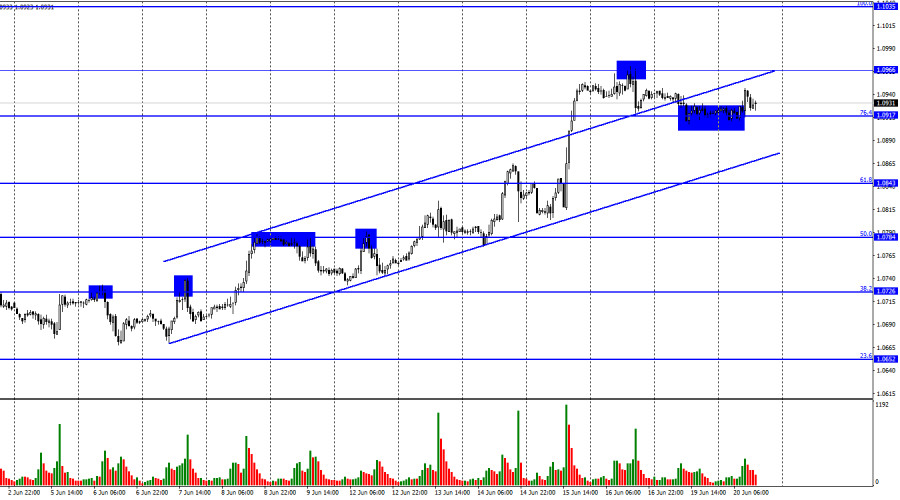 EUR/USD. 20 июня. Быки отбились от медведей около уровня 1,0917.ИнстаФорекс - Instaforex, 2 года назад Добрый день, уважаемые трейдеры! Пара EUR/USD в понедельник выполнила падение к уровню коррекции 76,4% – 1,0917, отбой от него и теперь имеет возможность возобновить процесс роста в направлении уровня 1,0966, который в прошлый раз преодолеть не сумела. Закрепление курса пары под уровнем 1,0917 сработает в пользу американской валюты и возобновления падения в направлении нижней линии восходящего трендового коридора. Закрытие под коридором изменит настроение трейдеров на «медвежье». В понедельник информационный фон отсутствовал, а во вторник ожидается лишь один экономический отчет. Безусловно, можно вспомнить о достаточно большом количестве выступлений членов Совета управляющих ЕЦБ в понедельник, но ничего важного они не сообщили рынку. Все они в той или иной степени продолжают сетовать на высокую инфляцию в Еврозоне, на низкие темпы ее снижения и продолжают настаивать на дальнейшем ужесточении ДКП. Подобную риторику рынок слышит уже несколько месяцев минимум. Таким образом, вчера на основании новой серии заявлений и призывов продолжать повышать ставку европейская валюта не продолжила свой рост. Сегодня же мы станем свидетелями отчета по строительным разрешениям в США. Определенное влияние на настроение трейдеров этот показатель может оказать, но я не думаю, что сильное. Еще с прошлой пятницы пара торгуется в диапазоне 1,0917 – 1,0966 и пока нет признаков, что она собирается покинуть ее. Таким образом, первым делом нужно дождаться выхода из этого диапазона, а уже затем рассуждать, в какую сторону может двинуться пара далее. На этой неделе будет несколько важных событий и даже заседание Банка Англии является важным для евровалюты, так как неделей ранее заседание ЕЦБ сильно повлияло и на британца. Все наиболее интересные и сильные движения еще впереди. На 4-часовом графике пара выполнила рост к уровню Фибо 50,0% – 1,0941. «Медвежья» дивергенция у индикатора CCI, которая образовалась на прошлой неделе, отменилась. Новых назревающих дивергенций не наблюдается ни у одного индикатора. Отбой от уровня 1,0941 сработает в пользу валюты США и некоторого падения в направлении 1,0610. Закрепление котировок над уровнем 1,0941 повысит шансы на продолжение роста в направлении следующего уровня коррекции 61,8% – 1,1273. Отчет Commitments of Traders (COT):