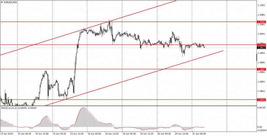 Начинается новая торговая неделя достаточно скучно. Макроэкономических отчетов на понедельник и вторник практически не было, а те, которые были, практически никакого влияния на обе валютные пары не оказали. Состоялась целая серия выступлений представителей ЕЦБ и ФРС, но и они не впечатлили участников рынка. Волатильность по обеим пара остается невысокой, что затрудняет процесс торговли. Сегодня ситуация кардинально измениться только для фунта. Для него утром уже был опубликован отчет по британской инфляции, которая осталась на уровне 8,7%, а базовая инфляция выросла до 7,1%. Такие цифры можно считать полнейшим провалом. Те движения пары, которые мы уже увидели, можно считать «отсутствие реакции», так как после столь резонансного отчета можно было рассчитывать на движение более сильное, чем 45 пунктов. Тем не менее, день еще не закончен. Для евровалюты сегодня макроэкономических отчетов не будет. Как и для доллара. Разбор фундаментальных событий: