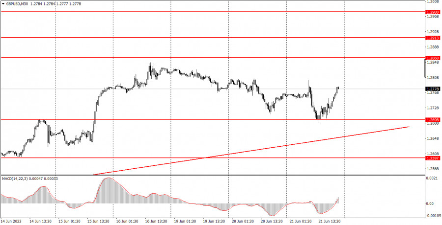 Из фундаментальных событий четверга, естественно, выделяется заседание Банка Англии. Никто не сомневается в том, что ключевая ставка вырастет через несколько часов еще на 0,25%, а некоторые эксперты после вчерашнего отчета по инфляции считают, что ставка может вырасти даже на 0,5%. Мы не считаем, что это произойдет, но в любом случае нас ждет повышенная волатильность. Также следует выделить второе выступление Джерома Пауэлла в Конгрессе США, так как вчера первое выступление спровоцировало довольно сильное движение по обеим парам. Вряд ли господин Пауэлл сегодня сообщит что-либо новое, но он и вчера ничего нового не сообщил. Таким образом, это событие тоже может оказать значительное влияние на движение обеих пар. Все остальные события носят второстепенный, фоновый характер. В Евросоюзе состоится очередное выступление Луиса де Гиндоса, в США – сразу несколько представителей монетарного комитета ФРС поделятся своим мнением относительно текущего положения вещей в экономике и политике центробанка. Будут выступать «первые лица» FOMC – Лоретта Мейстер, Кристофер Уоллер, Мишель Боуман, Томас Баркин. Все выступления можно считать интересными, но рынок сейчас отлично понимает, чего ожидать от ФРС, так как последние два выступления Пауэлла дали исчерпывающий ответ на этот вопрос. Общие выводы:В четверг важных и просто интересных событий будет предостаточно. Конечно, трейдерам следует сосредоточить основное внимание на заседании Банка Англии и втором выступлении Пауэлла. Однако и все остальные события имеют возможность повлиять на движение пар. Основные правила торговой системы:1) Сила сигнала считается по времени, которое потребовалось на формирование сигнала(отскок или преодоление уровня). Чем меньше времени потребовалось, тем сильнее сигнал. 2) Если около какого-либо уровня были открыты две или больше сделки по ложным сигналам, то все последующие сигналы от этого уровня следует игнорировать. 3) Во флэте любая пара может формировать массу ложных сигналов или же не формировать их вовсе. Но в любом случае при первых признаках флэта лучше переставать торговать. 4) Торговые сделки открываются во временной период между началом европейской сессии и до середины американской, когда все сделки должны быть закрыты вручную. 5) На 30-минутном ТФ по сигналам от индикатора MACD можно торговать только при наличие хорошей волатильности и тренда, который подтверждается линией тренда или трендовым каналом. 6) Если два уровня расположены слишком близко друг к другу(от 5 до 15 пунктов), то следует рассматривать их, как область поддержки или сопротивления. Что на графиках:Ценовые уровни поддержки и сопротивления – уровни, которые являются целями при открытии покупок или продаж. Около них можно размещать уровни Take Profit. Красные линии – каналы или линии тренда, которые отображают текущую тенденцию и показывают в какую сторону предпочтительно сейчас торговать. Индикатор MACD(14,22,3) – гистограмма и сигнальная линия – вспомогательный индикатор, который также можно использовать в качестве источника сигналов. Важные выступления и отчеты(всегда содержаться в календаре новостей) могут очень сильно влиять на движение валютной пары. Поэтому во время их выхода торговать следует максимально осторожно или выходить из рынка во избежание резкого разворота цены против 
