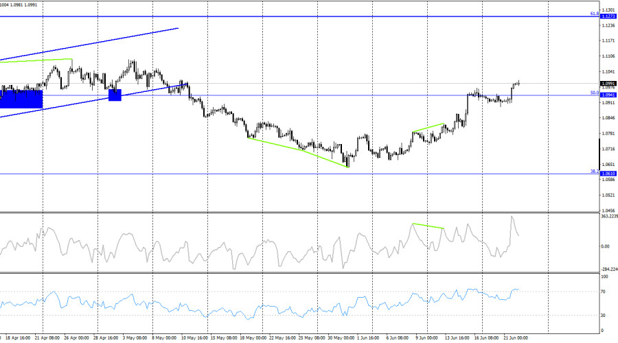 EUR/USD. 22 июня. Джером Пауэлл не порадовал, но и не разочаровалИнстаФорекс - Instaforex, 2 года назад Добрый день, уважаемые трейдеры! Пара EUR/USD в среду выполнила новый разворот в пользу европейской валюты и возобновила процесс роста. Закрепление курса пары над уровнем 1,0966 позволяет ожидать продолжение роста в направлении следующего уровня коррекции 100,0% – 1,1035. Восходящий трендовый коридор продолжает характеризовать текущее настроение трейдеров как «бычье». Лишь закрепление котировок под ним позволит рассчитывать на рост доллара США. Вчерашний день был важен только одним событием. Джером Пауэлл выступал с показаниями в Конгрессе США перед одним из комитетов Нижней палаты. В своей речи он отметил, что ставка, вероятно, продолжит расти во втором полугодии, но более медленными темпами, чем ранее. Экономический рост, по словам Пауэлла, продолжает замедляться, но рынок труда и безработица находятся в очень хорошем состоянии, что и позволяет ужесточить ДКП еще несколько раз. На мой взгляд, речь Пауэлла была достаточно «ястребиной», так как он уже открытым текстом заявил, что следует ожидать еще 1-2 повышения процентной ставки. Однако доллар США никакой эйфории по этому поводу не испытал. Несмотря на то, что FOMC готова «превысить план», американская валюта продолжает падение, что, с моей точки зрения, немного странно. В то же время сразу несколько представителей ЕЦБ уже выступили на этой неделе. Большая часть из них подтвердили, что ставка вырастет по итогам июльского заседания, но дальнейшие прогнозы затруднились дать. Июльские заседания ЕЦБ и ФРС могут стать последними, на которых будут повышены ставки. Любое повышение ставок в дальнейшем может носить «экстренный» характер. Сегодня состоится второе выступление Пауэлла, на этот раз в Сенате США. Суть выступления не будет отличаться от вчерашнего, но вопросы президенту ФРС будут задавать уже иные. Однако, даже «ястребиная» риторика Пауэлла вчера не поддержала доллар. На 4-часовом графике пара выполнила рост к уровню Фибо 50,0% – 1,0941 и закрепление над ним. «Медвежья» дивергенция у индикатора CCI, которая образовалась на прошлой неделе, отменилась. Новых назревающих дивергенций не наблюдается ни у одного индикатора. Закрепление котировок над уровнем 1,0941 повышает шансы на продолжение роста в направлении следующего уровня коррекции 61,8% – 1,1273. Отчет Commitments of Traders (COT):