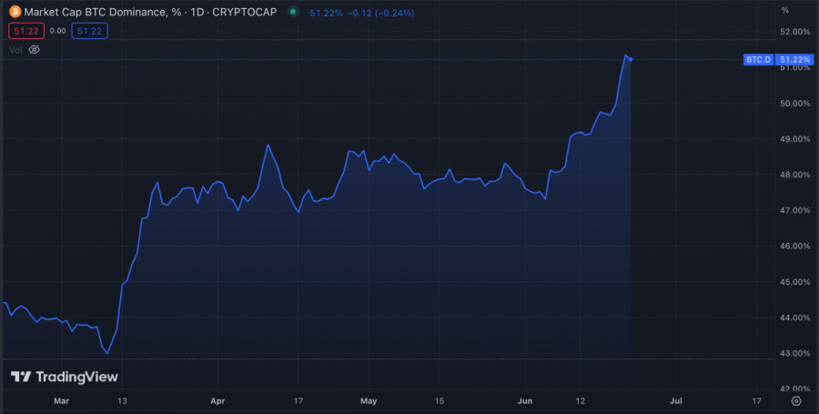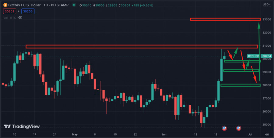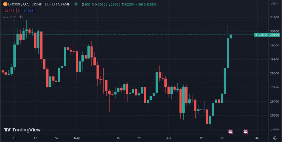 Биткоин за два дня отыграл майское падение: где проходит потенциал восходящего движения актива?ИнстаФорекс - Instaforex, 2 года назад На протяжении всего мая мы наблюдали, как цена Биткоина планомерно обновляет локальные минимумы. Этот процесс также сопровождался постепенным падением объемов торгов и нарастанием пессимистичных сениментов на рынке криптовалют. Большую часть июня цена Биткоина находилась в консолидационном движении. Однако за последние несколько дней крипторынок оправдал свою репутацию высоковолатильной индустрии. Всего за 5 дней объемы торгов криптовалютами возросли на 30%, цена Биткоина достигла уровня $30k и полностью отыграла майское падение цены. Вполне вероятно, что в рамках реализации текущего восходящего тренда локальные ценовые максимумы будут обновлены. Заявления главы ФРСНеожиданным сторонником крипторынка стал глава ФРС, который подлили масла в огонь восходящего тренда Биткоина и цифровых активов. Пауэлл признал, что ФРС рассматривает стейблкоины в качестве средства оплаты. Чиновник также отметил, что считает криптовалюты классом активов, чем значительно повысил интерес к BTC. Несмотря на весь позитив, Пауэлл отметил, что борьба с инфляцией в США еще далека от своего завершения. Чиновник считает целесообразным повысить ключевую ставку еще дважды в рамках текущего цикла. Это означает, что целевой показатель может достичь 6%-6,25%. На фоне заявления инвесторы на СМЕ закладывают 77%-ю вероятность повышения ставки уже в июле. Криптоиндустрия расправляет крыльяВ преддверии восходящего импульса Биткоина на рынке происходили много важных событий, таких как активное накопление BTC всеми категориями инвесторов и вливание больших объемов стейблкоинов. Однако мы хотим остановиться на других факторах, которые укрепили позиции крипто индустрии. Криптобиржа Binance выделила $1 миллиард для судебных разбирательств с SEC. Для примера, Ripple потратила около $150 миллионов для судебных тяжб с регулятором. Это событие укрепило веру инвесторов в криптоактивы, а потому в ближайшее время можно ждать снижение доминирования BTC и увеличение инвестиций в альткоины. Банковские гиганты Fidelity, Citadel Securities и Schwab запускают собственную крипто биржу под названием EDXM. Впервые крупные игроки мировой экономики открыто создают криптопродукт для широкого круга инвесторов. Также стало известно, что Fidelity и BlackRock подают заявку в SEC на регистрацию спотового Bitcoin ETF. Deutsche Bank подал заявку на получение лицензии по хранению цифровых активов, в том числе и криптовалют. Mastercard также зарегистрировал заявку на создание товарного знака для ряда инструментов на основе цифровых активов и технологий блокчейна. Все эти новости оказывают позитивное влияние, сподвигают инвесторов покупать криптовалюту и толкают рынок к новым максимумам. Bitcoin достиг $30k – что дальше?По состоянию на 22 июня Биткоин окончательно закрепился выше $30k при объемах торгов в районе $30 миллиардов. Актив подорожал на 21% за последние 7 дней, что является прямым следствием активизации торговой активности вследствие завершения периода накопления и позитивных новостей. Рассматривая ближайшие бычьи цели BTCUSD стоит выделить область $30,5k-$31k, где проходил предыдущий ценовой максимум. В краткосрочной перспективе именно этот рубеж станет ключевым для актива. Не стоит забывать, что вслед за столь м
