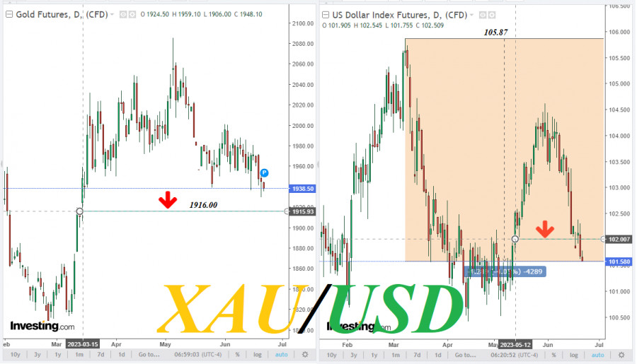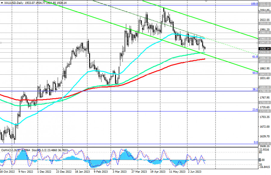 XAU/USD: доллар снижается; вместе с ним снижаются индексы и цены на золотоИнстаФорекс - Instaforex, 2 года назад В опубликованном на прошлой неделе отчете по денежно-кредитной политике руководители ФРС признали, что инфляция все еще слишком высока, а в секторе услуг нет явных признаков ослабления. Понимая также, что перспективы кредитно-денежной политики в значительной степени остаются неопределенными, руководители американского ЦБ все же сохранили ее параметры в минувшую среду без изменений, но признали необходимым дальнейшее ужесточение. Теперь участники рынка оценивают вероятность повышения ставки на 25 б.п. в июле примерно в 70%, согласно данным CME Group. И вот глава ФРС Джером Пауэлл, выступая в среду в Комитете по финансовым услугам Палаты представителей, практически повторил основные тезисы сопутствующего заявления ФРС, сказав, что все члены FOMC признают целесообразность повышения процентных ставок к концу года "несколько дальше" от текущих уровней. "Инфляционное давление продолжает оставаться высоким, и процессу возвращения инфляции к 2% предстоит пройти долгий путь, - сказал Пауэлл, - "мои коллеги и я понимаем трудности, которые вызывает высокая инфляция, и мы по-прежнему твердо намерены вернуть инфляцию к нашей цели 2%, при этом "возможно, имеет смысл повышать ставки более умеренными темпами". "Мы продолжим принимать решения от заседания к заседанию на основе поступающих данных, их последствий для перспектив и баланса рисков", - добавил Пауэлл. После вчерашнего выступления Пауэлла основные американские фондовые индексы ускорили свое снижение, и сегодня их негативная внутри недельная динамика продолжилась в первой половине торгового дня. Тем не менее доллару не удалось извлечь выгоду от этого: его индекс DXY пробил вчера отметку 102.00 и сегодня уже опустился к отметке 101.60, минимуму с 12 мая. На рынке наблюдается очередной диссонанс: основные американские и мировые фондовые индексы снижаются, вместе с ними снижаются котировки доллара и золота!!!, но растут основные сырьевые и европейские валюты. Сегодня Джером Пауэлл вновь выступит в Конгрессе, где расскажет о перспективах монетарной политики ФРС. Скорее всего, он повторит свое вчерашнее выступление, не добавив в него ничего нового. Поэтому доллар, скорее всего, останется под давлением, пока из США не начнет поступать важная макро статистика, а она запланирована уже на завтра: в 13:45 (GMT) будут опубликованы предварительные индексы (от S&P Global) деловой активности (PMI) в производственном секторе, составной и в секторе услуг американской экономики. Они являются важным индикатором состояния данных секторов и американской экономики в целом. Данные выше значения 50 говорят об ускорении активности, что позитивно влияет на котировки национальной валюты. Прогноз на июнь: 48,5, 54,4 и 54,0, соответственно (подробнее см. в Важнейшие экономические события недели 19.06.2023 – 25.06.2023). При снижении же показателя ниже прогноза и особенно ниже значения 50 доллар может краткосрочно резко ослабнуть. Что же касается упомянутого выше золота, то его котировки продолжают сегодня снижаться, в то время как пара XAU/USD снижается в сторону нижней границы нисходящего канала на дневном графике цены, проходящей в зоне ключевых уровней поддержки 1916.00, 1896.00. Пробой этих уровней и уровня поддержки 1885.00 откроет дорогу к более глубокому