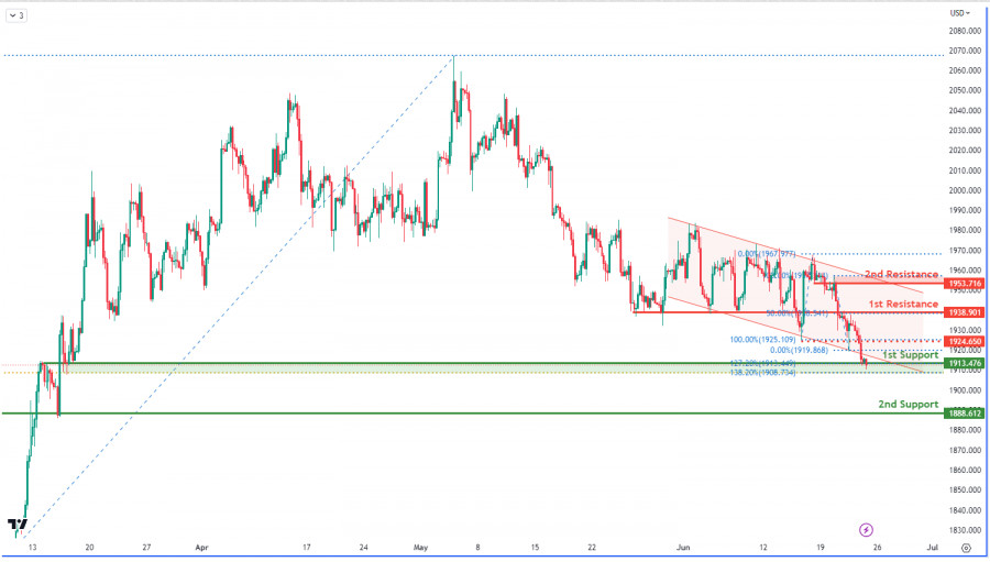 XAU/USD, H4 | Возможно продолжение медвежьей тенденцииИнстаФорекс - Instaforex, 2 года назад График XAU/USD указывает на наличие медвежьего импульса, поскольку цена прорывается за нижнюю линию канала, что указывает на продолжение предыдущего медвежьего тренда. В краткосрочной перспективе возможен рост цены к первому уровню сопротивления 1938,90 с последующим разворотом и снижением к первому уровню поддержки 1913,47. Первый уровень поддержки имеет большое значение, поскольку он представляет собой поддержку с перекрытием и совпадает с уровнем коррекции Фибоначчи 61,80%. Кроме того, второй уровень поддержки 1888,61 служит еще одной поддержкой с перекрытием. С другой стороны, первое сопротивление на уровне 1938,90 действует как сопротивление с перекрытием и усилено коррекцией Фибоначчи 50%. Второе сопротивление на уровне 1953,71 также действует как сопротивление с перекрытием, а промежуточное сопротивление на уровне 1924,65 может повлиять на движение цены. Материал предоставлен компанией InstaForex - www.instaforex.com |