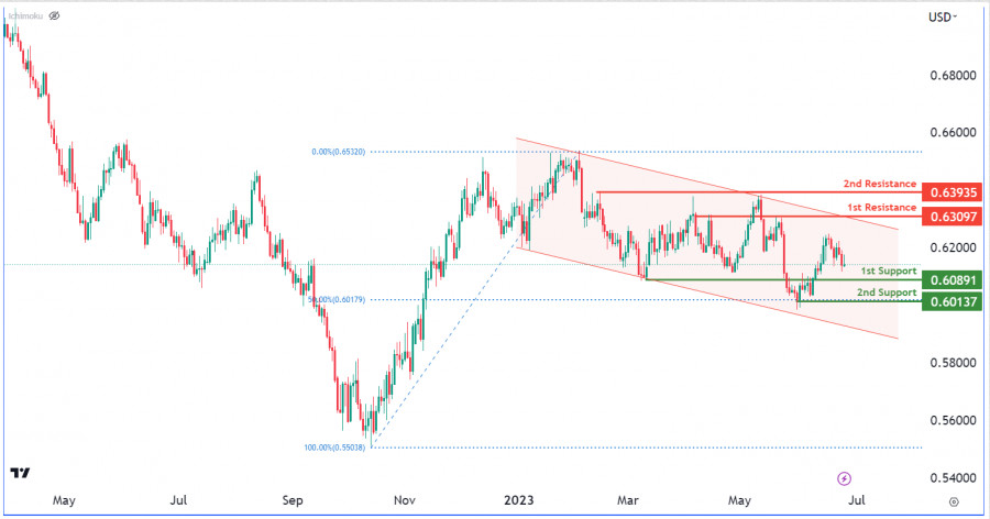 NZD/USD, D1 | Движение внутри нисходящего канала?ИнстаФорекс - Instaforex, 2 года назад На графике валютной пары NZD/USD мы можем наблюдать медвежий импульс в рамках нисходящего канала, что указывает на возможность дальнейшего движения вниз. Цена может продолжить свой медвежий тренд к 1-му уровню поддержки 0,6089, который играет роль поддержки с откатом и локального минимума. Сопротивление расположенное на уровнях 0,6309 и 0,6393 препятствует восходящему движению. |