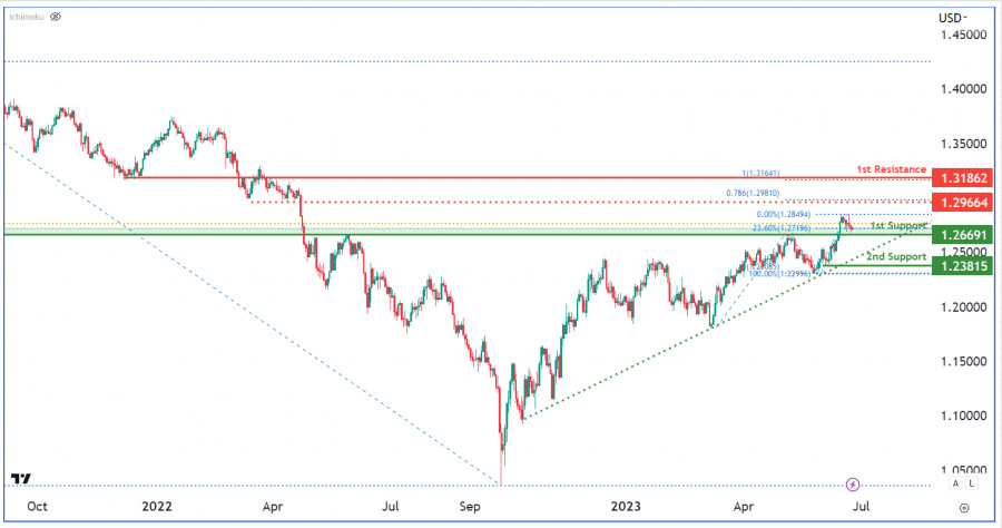 На графике валютной пары GBP/USD наблюдается бычий импульс, при этом цена расположена выше значимой линии восходящего тренда. Существует вероятность дальнейшего восходящего движения. Трейдеры должны учитывать возможность бычьего отскока от 1-го уровня поддержки (1,2669), усиленного коррекцией Фибоначчи 23,60%, и 2-го уровня поддержки (1,2381), являющегося локальным минимумом. Осторожность не помешает, поскольку 1-й уровень сопротивления (1,3186) может преградить путь дальнейшему продвижению цены вверх, а промежуточное сопротивление (1,2966), которое совпадает с проекцией Фибоначчи 78,60%, может выступить в качестве сопротивления с откатом.
