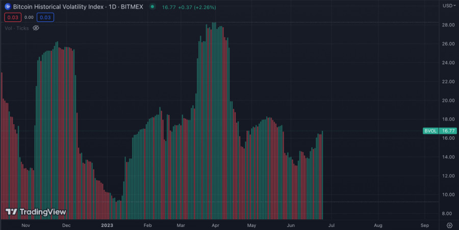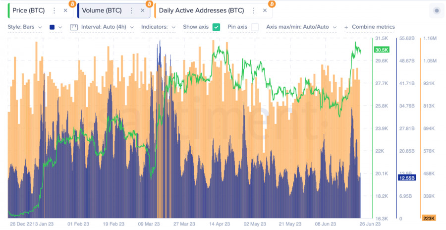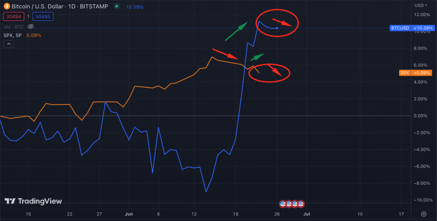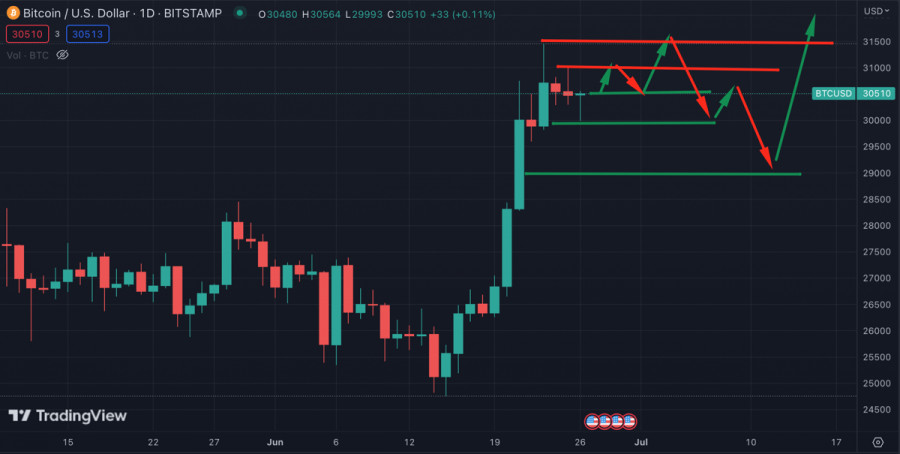 Bitcoin удерживает уровень $30k: стоит ли ждать очередной этап бычьего движения?ИнстаФорекс - Instaforex, 2 года назад Прошлая неделя оказалась наполненной неожиданностями потому, что главная криптовалюта завершила период консолидации и начала восходящее движение. В результате Биткоин всего за два дня отыграл медленное падение цены в мае. Впоследствии BTC продолжил восходящее движение и достиг локального максимума. Пятничную торговую сессию криптовалюта завершила ретестом уровня $31,4k, что является обновлением локального максимума за последний год. В субботу Биткоин совершил второй ретест уровня $31k, однако впоследствии цены актива начала снижаться под давлением продавцов. Воскресенье Bitcoin завершил на медвежьей ноте, но удержал уровень $30k, что может свидетельствовать о дальнейшем восходящем движении криптовалюты. Фундаментальные факторыВо многом снижение цены Биткоина было связано с падением торговой активности на выходных, в первую очередь крупных фондов, которые составляют основу бычьего тренда BTC. Вторым важным фактором является достижение ключевых отметок выше $31k, что значительно активизировало продавцов. Однако есть также и третья причина, которая заключается в общем падении торговой активности на финансовых рынках. На это указывает временное усиление корреляции между индексом SPX и Биткоином. Вполне вероятно, что локальный рост уровня созависимости был связан с новостями о снижении индекса опережающих индикаторов в США, что исторически указывает на рецессию. Аналитики Nordea заявляют, что ВВП США сократится на 2% уже в текущем году. Совокупность этих новостей возымела сильный эффект на инвестиционное сообщество после того, как глава ФРС заявил о планах продолжить повышение ставки. СМЕ закладывает 77% вероятность повышения рейта уже в июле, а потому рынки особенно остро реагируют на известия, связанные с рецессией и экономикой США. Крипто рынок продолжает оживатьНесмотря на общую негативную ситуацию на финансовых рынках, связанную с политикой ФРС, крипто инвесторы могут похвастаться позитивным новостным фоном. Сообщается, что Комиссия по ценным бумагам и фондовым биржам одобрила первый крипто ETF с кредитным плечом в США — 2x Bitcoin Strategy ETF от Volatility Shares. ETF фонд будет котироваться на CME по индексу Bitcoin Futures Daily Roll Index. Также сообщается, что крупнейший банк Бразилии Itau, с капиталом $2 триллиона, присоединяется к национальной Биткоин-ассоциации. Еще одним немаловажным событием станет экспирация в BTC на $3,3 миллиарда, и ETH на $2,1 миллиарда. Обычно такие события сопровождаются высоким уровнем волатильности и ценовыми рывками. Анализ BTCUSDЧто касается технической стороны, то Биткоин торгуется вблизи уровня $30,5k при суточных объемах торгов в районе $12 миллиардов. Вероятней всего во второй половине дня ситуация изменится и торговая активность начнет увеличиваться. Криптовалюта выглядит по-бычьи и в ближайшее время стоит ожидать движение к ключевым ценовым уровням. Быкам удалось отстоять уровень $30k, который является гарантией устойчивости текущего восходящего движения. Если открытие американского рынка возымеет позитивный эффект, то актив возобновит восходящее движение к уровню $31k, и далее к $31,5k. Окончательное закрепление выше данных отметок является ключевой целью BTC в краткосрочной перспективе. При этом нельзя отметать вероятность л