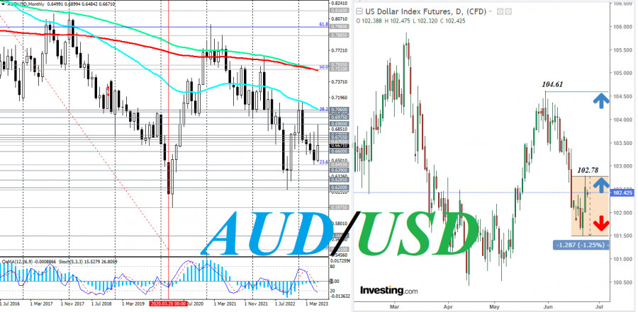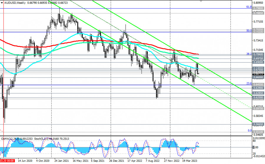 AUD/USD: возобновится ли рост?ИнстаФорекс - Instaforex, 2 года назад После серьёзного укрепления с начала месяца минувшая неделя оказалась неудачной для австралийского доллара и разочаровывающей для покупателей пары AUD/USD. Австралийский доллар резко укрепился, а пара AUD/USD выросла, после завершившегося в начале месяца очередного заседания РБА, на котором процентная ставка была неожиданно повышена руководителями банка на 25 базисных пункта, до 4,10%. В сопутствующем заявлении они отметили, что приняли решение на фоне сохраняющегося давления инфляции, которая остаётся на недопустимо высоком уровне 7,0% (целевой уровень РБА составляет 2,0% - 3,0%), не исключив также возможности дальнейшего повышения процентной ставки, если тому будет соответствовать экономическая ситуация, а экономическому росту и благосостоянию граждан не будет нанесен значительный урон. Затем опубликованная позднее макро статистика, которая указала на рост деловой активности в сфере услуг Австралии и улучшение ситуации на национальном рынке труда, придала австралийскому доллару дополнительный бычий импульс. Так, индекс деловой активности PMI в сфере услуг от Commonwealth Bank в мае поднялся до 52,1 (против предыдущего значения 51,8 и нейтрального прогноза), а данные по занятости, опубликованные в середине месяца Австралийским бюро статистики, указали на рост занятости в стране на +75,9 тыс. (против прогноза о росте на +17,5 тыс. и предыдущего значения -4,3 тыс.) и на снижение безработицы на 0,1% (против предыдущего значения 3,7% при нейтральном прогнозе). И тем не менее, в дальнейшем австралийский доллар ослаб, а минувшая неделя откинула пару AUD/USD к уровню 0.6670, что наполовину нивелировало достижение этого, пока еще не закончившегося, месяца. В частности, этому способствовали умеренно ястребиные заявления главы ФРС Пауэлла, сделанные им на минувшей неделе в Конгрессе, где он подтвердил, что было бы «целесообразным повысить ставки еще раз в этом году и, возможно, еще два раза». "Инфляционное давление продолжает оставаться высоким, и процессу возвращения инфляции к 2% предстоит пройти долгий путь", - сказал Пауэлл, отметив, что в ФРС понимают «трудности, которые вызывает высокая инфляция», и «по-прежнему твердо намерены вернуть инфляцию к цели 2%". Поступавшая же на прошлой неделе из Австралии слабая макро статистика стала дополнительным негативным для AUD фактором (об особенностях торговли парой AUD/USD см. в статье AUD/USD: валютная пара (характеристики, рекомендации). Так, предварительный австралийский индекс деловой активности PMI за июнь в производственном секторе вышел со значением 48,6, оставшись в зоне ниже отметки 50, а аналогичный PMI для сферы услуг скорректировался с 52,1 до 50,7. При этом, индекс опережающих экономических индикаторов от Westpac в мае опустился на 0,27% после сокращения на 0,03% в прошлом месяце, а заместитель управляющего РБА Мишель Буллок спрогнозировала рост безработицы до 4,5%, с 3,6% в настоящий момент. Также давление на австралийский доллар оказало решение на прошлой неделе Народного банка Китая снизить процентную ставку на 10 базисных пунктов, до 3,55%, что говорит об обеспокоенности руководством китайского ЦБ замедлением экономического роста (кстати, агентство S&P Global недавно опубликовало отчет о перспективах китайской экономики, в котором говорится о снижении прогноза роста экономики Китая на 2