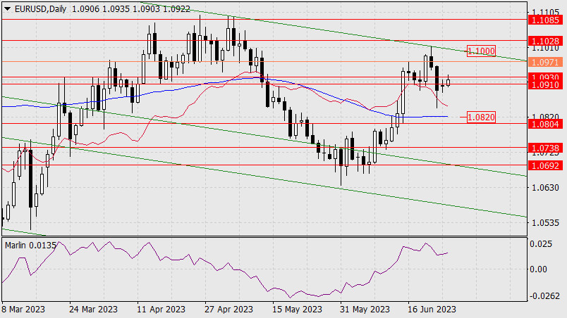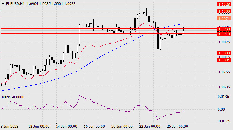 Прогноз по EUR/USD на 27 июня 2023 годаИнстаФорекс - Instaforex, 2 года назад EUR/USD Целью движения выступает диапазон 1.0804/20, заданный линейным уровнем поддержки и индикаторной линией Крузенштерна дневного масштаба. Если цена найдёт в себе силы выйти над 1.0930, то первой целью роста станет промежуточный уровень 1.0971. Далее возможно продолжение этого роста до 1.1000.