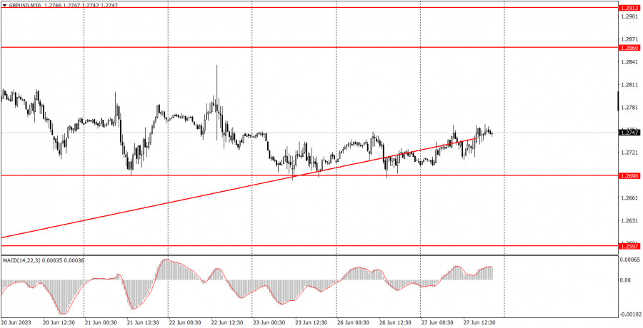 Из фундаментальных событий в среду мы выделяем, конечно же, выступление главы ФРС Джерома Пауэлла. Несмотря на то, что он за последние две недели выступал три раза(и каждое его выступление можно считать важным), новые комментарии в его исполнении могут последовать. Риторика председателя ФРС вряд ли поменяется. Если он заявил в Конгрессе о необходимости продолжать ужесточение монетарной политики, то наверняка тоже самое скажет и на экономическом форуме Европейского центрального банка. Доллар США может теоретически получить поддержку от «ястребиных» высказываний, но рынок сейчас опять более благосклонно смотрит в сторону покупок евро и фунта. Также на завтра запланировано сразу два выступления Кристин Лагард, Луиса де Гиндоса и Филиппа Лейна. Каждый из них по отдельности может сделать важные заявления «ястребиного» характера, но общая риторика представителей ЕЦБ не может видоизменяться каждую неделю. Скорее всего, мы услышим все тоже, что и ранее. Рынок может сдержанно отреагировать покупками евровалюты. В Великобритании выступит с речью главный экономист Банка Англии Хью Пилл и, пожалуй, это будет действительно интересно. Если, конечно, господин Пилл затронет темы монетарной политики и ставок. Банк Англии откровенно удивил на прошлой неделе, повысив ключевую ставку на 0,5%, и теперь всех интересует, каковы будут дальнейшие действия британского регулятора. Общие выводы:В среду важных событий будет предостаточно. Заранее никогда нельзя знать, будет ли речь того или иного чиновника важной. Поэтому чисто теоретически, все завтрашние выступления могут быть «пустыми». Но мы все же советуем помнить о времени их начала и ожидать изменения динамики движения обеих пар. Основные правила торговой системы:1) Сила сигнала считается по времени, которое потребовалось на формирование сигнала(отскок или преодоление уровня). Чем меньше времени потребовалось, тем сильнее сигнал. 2) Если около какого-либо уровня были открыты две или больше сделки по ложным сигналам, то все последующие сигналы от этого уровня следует игнорировать. 3) Во флэте любая пара может формировать массу ложных сигналов или же не формировать их вовсе. Но в любом случае при первых признаках флэта лучше переставать торговать. 4) Торговые сделки открываются во временной период между началом европейской сессии и до середины американской, когда все сделки должны быть закрыты вручную. 5) На 30-минутном ТФ по сигналам от индикатора MACD можно торговать только при наличие хорошей волатильности и тренда, который подтверждается линией тренда или трендовым каналом. 6) Если два уровня расположены слишком близко друг к другу(от 5 до 15 пунктов), то следует рассматривать их, как область поддержки или сопротивления. Что на графиках:Ценовые уровни поддержки и сопротивления – уровни, которые являются целями при открытии покупок или продаж. Около них можно размещать уровни Take Profit. Красные линии – каналы или линии тренда, которые отображают текущую тенденцию и показывают в какую сторону предпочтительно сейчас торговать. Индикатор MACD(14,22,3) – гистограмма и сигнальная линия – вспомогательный индикатор, который также можно использовать в качестве источника сигналов. Важные выступления и отчеты(всегда содержаться в календаре новостей) могут очень сильно влиять на движение валютной пары. По