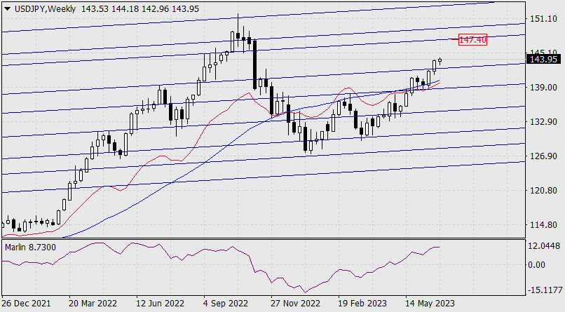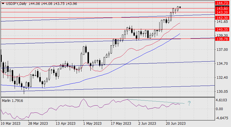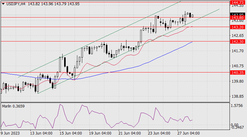 Прогноз по USD/JPY на 28 июня 2023 годаИнстаФорекс - Instaforex, 2 года назад USD/JPY Пока цена может безопасно дорасти до первого целевого сопротивления 144.73, в этом не помешает даже дивергенция, но от уровня может произойти срыв. Если дивергенция окажется сломленной, то рост может продолжиться до ближайшей вложенной линии ценового восходящего канала, хорошо видного на недельном графике – цель 147.40. От этого уровня уже возможна интервенция с высокой долей вероятности. Если цена вернётся под уровень 143.20, могут последовательно открыться цели 142.30 и 140.35.