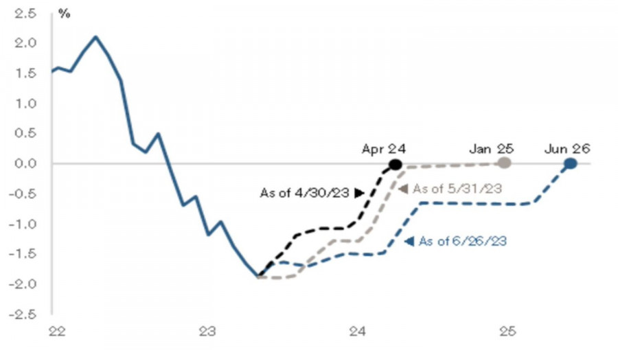 Золото сбрасывают с рукИнстаФорекс - Instaforex, 2 года назад Когда борьба центробанков с инфляцией продолжается, рост геополитических рисков является лишь временным фактором поддержки золота. Мятеж наемников в России, казалось бы, вернул его к жизни. Однако восстание быстро прекратилось, и градус неопределенности снизился. Неудивительно, что котировки XAU/USD продолжили падать. Драгметалл не приносит процентного дохода. В этом смысле он похож на японскую иену, центробанк-эмитент которой удерживает доходность на низком уровне. В результате на фоне ралли ставок глобального рынка долга валюта Страны восходящего солнца становится явным аутсайдером G10. Обречено на падение и золото. Причинами его разгрома в июне являются неоправдавшиеся ожидания скорой рецессии в экономике США и сохранение решительности центробанков в борьбе с инфляцией. Предыдущие инверсии кривой доходности сигнализировали об однозначно наступающем спаде. Он приходил в среднем через 11 месяцев с момента начала перевернутой кривой. Неудивительно, что многие эксперты Bloomberg ставили на сентябрь. Credit Suisse Group AG, напротив, считает, что рецессии случаются, когда индикатор начинает возвращаться в нормальное состояние. Это ожидается только в 2026. Действительно, последняя статистика по продажам новых домов, заказам на товары длительного пользования и потребительскому доверию радует глаз. Экономика США крепко стоит на ногах, и ФРС может позволить себе и дальше повышать ставку по федеральным фондам. Динамика кривой доходности США Давление на золото оказывает не только ФРС, но и другие центробанки мира. Австралия и Канада возобновили циклы ужесточения денежно-кредитной политики. Еврозона намерена поднять ставку по депозитам до 4%, а Банк Англии – до 6,25%. В таких условиях ралли доходности облигаций на глобальном рынке выглядит закономерным. Не приносящий процентный доход драгметалл чувствует себя не в своей тарелке. Ему не помогает даже ослабление доллара США против евро на фоне «ястребиных» комментариев членов Управляющего совета во главе с Кристин Лагард. Что может спасти золота? Сейчас сложно ответить на этот вопрос. Оно стало жертвой чрезмерных страхов инвесторов по поводу приближающейся рецессии в Штатах и надежд быстрое замедление инфляции. Все это усиливало риски «голубиного» разворота ФРС в 2023. Нынче инвесторы об этом даже не думают. Их больше волнует вопрос, как высоко заберется ставка по федеральным фондам. Динамика американских индикаторов Срочный рынок выдает 77%-ю вероятность ее роста на 25 б.п., до 5,5% в июле и лишь 20%-й шанс повышения до 5,75% в декабре. Если последняя цифра продолжит увеличиваться, доллар США окрепнет, доходность казначейских облигаций вырастет, а котировки XAU/USD продолжат пике. Технически на дневном графике золота был четко реализован паттерн Всплеск и полка. Прорыв его нижней границы на $1930 за унцию позволил нам сформировать шорты. Будем их наращивать. В качестве таргетов выступают отметки $1865 и $1845. Материал предоставлен компанией InstaForex - www.instaforex.com |