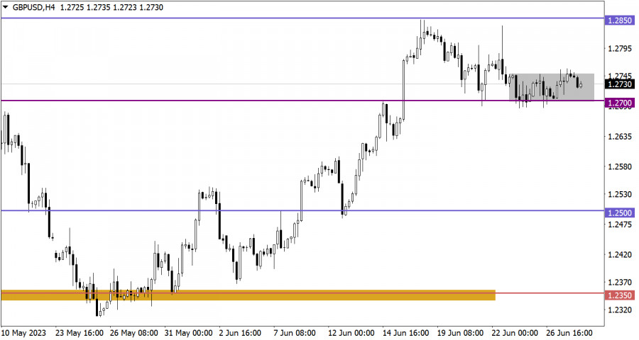 Сегодня не предвидится публикации значимых статистических данных в ЕС, Великобритании и Соединенных Штатах. Однако запланированы выступления представителей ЕЦБ и ФРС, которые могут оказать влияние на финансовые рынки. Такие выступления обычно привлекают внимание участников рынка, поскольку содержащаяся в них информация может дать представление о монетарной политике и экономических перспективах соответствующих стран. Такие события могут вызвать спекулятивные движения на рынке и повлиять на курсы валют и активов. Торговый план – EUR/USD 28 июняВ случае продолжения роста, возможно достижение уровня 1.1000, что может указывать на дальнейшую пролонгацию среднесрочного восходящего тренда. Однако следует учесть возможность отскока цены от психологического уровня, как это уже наблюдалось на прошлой неделе. Поэтому основной технический сигнал о продолжении тренда будет учитываться участниками рынка только при удержании цены выше уровня 1.1050. Торговый план – GBP/USD 28 июняНа рынке продолжается боковой диапазон между уровнями 1.2700 и 1.2750. В связи с этим тактика работы с ожиданием пробоя границ диапазона является разумной. Однако необходимо учесть, что пробой границ будет подтвержден только после удержания цены выше или ниже соответствующего уровня в течение не менее четырехчасового периода. Для восходящего сценария необходимо, чтобы цена удерживалась выше уровня 1.2750. В этом случае возможно последовательное восстановление стоимости фунта стерлингов после недавнего коррекционного движения. Нисходящий сценарий будет рассматриваться, если цена стабильно удерживается ниже уровня 1.2700 в течение дневного периода. Это может привести к продолжению текущего коррекционного движения. Что отражено на торговых графиках?