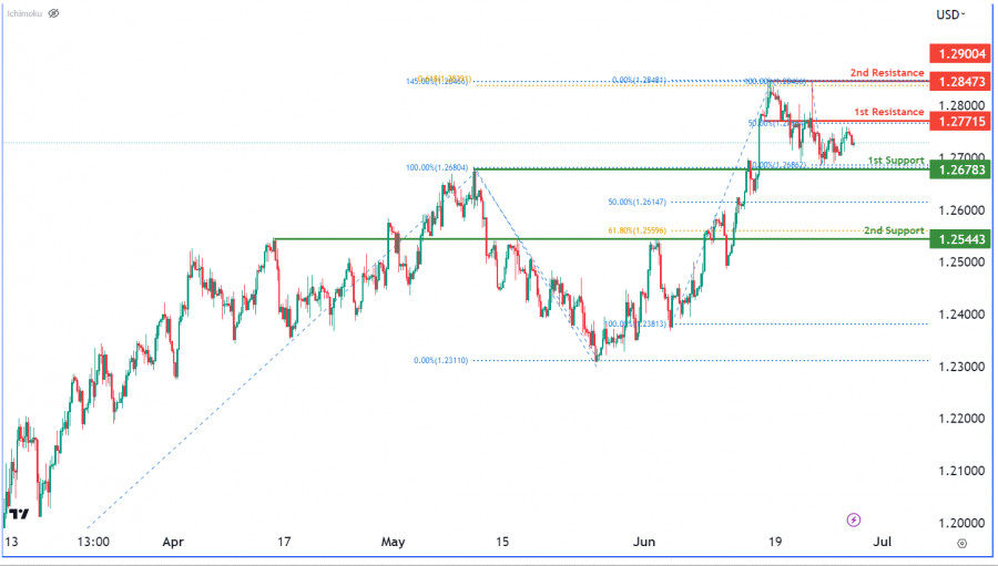 GBP/USD: ожидается усиление медвежьего импульса. Прогноз на 28 июня 2023ИнстаФорекс - Instaforex, 2 года назад Существует вероятность того, что цена продолжит нисходящее движение к 1-му уровню поддержки 1.2678. Дополнительная поддержка находится на 2-м уровне поддержки 1.2544, выступающем в качестве поддержки при откате и совпадающем с 61.80% уровнем коррекции Фибоначчи. С другой стороны, 1-й уровень сопротивления расположен на отметке 1.2771 и может выступить препятствием восходящему движению цены. Кроме того, 2-й уровень сопротивления на отметке 1.2847 представляет собой уровень свинг-хай и совпадает с 61.80% проекцией Фибоначчи и 145.00% уровнем коррекции Фибоначчи, что свидетельствует о наличии области слияния уровней Фибоначчи. Материал предоставлен компанией InstaForex - www.instaforex.com |