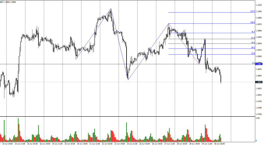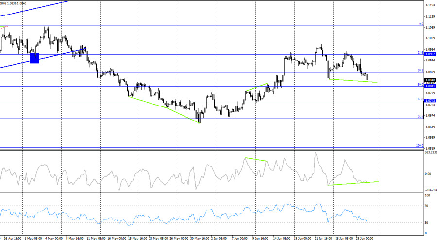 EUR/USD. 30 июня. Инфляция в Евросоюзе не разочаровалаИнстаФорекс - Instaforex, 2 года назад Добрый день, уважаемые трейдеры! Пара EUR/USD выполнила новый разворот в пользу валюты США и возобновила процесс падения в четверг. Около уровня коррекции 23,6% – 1,0923 не было образовано четкого сигнала на продажу. Вполне возможно, пара продолжала бы процесс роста вчера, но отчет по ВВП США за первый квартал остановил быков и заставил медведей вернуться на рынок. Таким образом, у нас началась новая волна вниз. Лоу последней волны вниз находится на уровне 1,0882, закрепление пары под этим уровнем подтвердило наш «медвежий» тренд. Теперь у нас пробиты лоу сразу двух последних волн вниз, что еще сильнее уверяет меня в продолжении падения европейской валюты. Пока что оснований ожидать новую волну вверх нет. Вчера основное движение дня было связано с американской статистикой по ВВП и заявкам на пособия по безработице. Оба отчета оказались сильнее ожиданий трейдеров, что и помогло доллару показать существенный рост. Сегодня вышел отчет по инфляции в Евросоюзе за июнь, по поводу которого у трейдеров были серьезные опасения, так как вчера в Германии был зафиксирован рост инфляции. Но опасения не оправдались, индекс потребительских цен замедлился до 5,5%, что даже лучше прогнозов(5,6%). Базовая инфляция в июне выросла до 5,4%, что совпало с ожиданиями трейдеров. На часовом графике я пока не вижу оснований для завершения нисходящей волны. Но они назревают на 4-часовом. На 4-часовом графике пара выполнила разворот в пользу доллара США и закрепление под уровнем коррекции 38,2% – 1,0877. Таким образом, падение котировок может быть продолжено в направлении следующего уровня Фибо 50,0% – 1,0811. Сегодня начала назревать бычья дивергенция у индикатора MACD, но она еще не образовалась. Таким образом, в ближайшее время возможен восходящий откат, который на часовом графике станет волновой вверх в «медвежьем» тренде. Но сигналов на покупку пока нет. Отчет Commitments of Traders (COT):