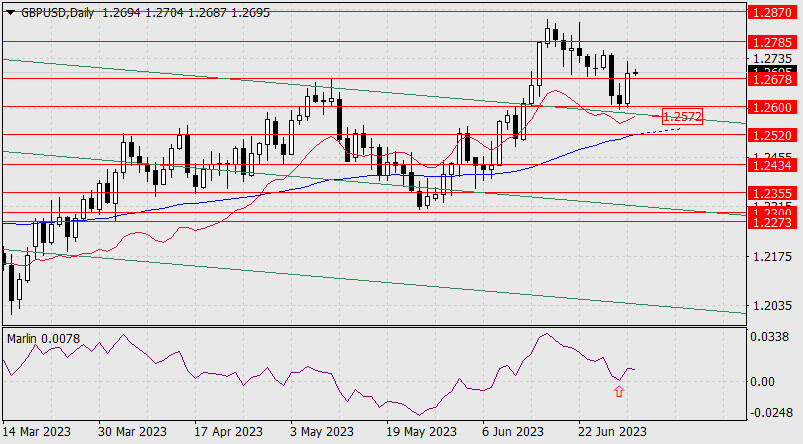 Прогноз по GBP/USD на 3 июля 2023 годаИнстаФорекс - Instaforex, 2 года назад GBP/USD По основному сценарию цена тяготеет к целевой поддержке 1.2520, где находится сейчас линия Крузенштерна, что автоматически приведёт к уходу цены под вложенную линию ценового канала зелёного цвета (1.2572), а это уже признак развития среднесрочного понижения.