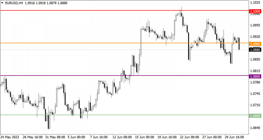 Учимся и анализируем, торговый план для начинающих трейдеров EUR/USD и GBP/USD 03.07.23ИнстаФорекс - Instaforex, 2 года назад Детали экономического календаря от 30 июня В прошлую пятницу были опубликованы предварительные данные по инфляции в Еврозоне за июнь. Месячный индекс потребительских цен вырос на 0,3%, превысив ожидания в 0%. В годовом исчислении инфляция снизилась с 6,1% до 5,5%, что оказалось немного лучше прогнозов в 5,6%. Также базовый индекс потребительских цен (исключая цены на продукты питания и энергоресурсы) увеличился с 5,3% до 5,4% в годовом выражении, превзойдя прогнозы в 5,5%. Месячная базовая инфляция составила 0,3%, что также оказалось лучше ожиданий в 0,7%. Итак, можно сделать вывод, что снижение цен на энергоресурсы сдержало инфляционный импульс. Однако базовая инфляция, исключая эти факторы, продемонстрировала стабильный характер, и Европейскому центральному банку потребуется больше времени, чтобы вернуть ее к целевым показателям в 2%. Следовательно, текущие данные по инфляции, скорее всего, не окажут серьезного влияния на мнение ЕЦБ относительно дальнейшего ужесточения денежно-кредитной политики и продолжительности поддержания высоких процентных ставок, о чем уже говорила Кристин Лагард ранее.