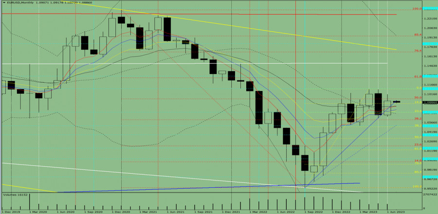Технический анализ на июль месяц 2023 года по валютной паре EUR/USDИнстаФорекс - Instaforex, 2 года назад Трендовый анализ. В июле цена от уровня 1.0909 (закрытие июньской месячной свечи), возможно, совершит движение вверх до цели 1.1095 – верхний фрактал (жёлтая пунктирная линия). При тестировании этого уровня возможно движение цены вверх с целью 1.1273 – откатный уровень 61.8% (красная пунктирная линия). Рис. 1 (месячный график). Индикаторный анализ: - индикаторный анализ – вверх; Вывод по комплексному анализу: вероятней всего верхняя работа. Общий итог расчёта свечи валютной пары EUR/USD по месячному графику: цена, вероятней всего, будет иметь восходящую тенденцию с наличием первой нижней тени (первая неделя месяца – чёрная) у месячной белой свечи и отсутствием второй верхней тени (последняя неделя - белая). Общий сценарий: цена от уровня 1.0909 (закрытие июньской месячной свечи), возможно, совершит движение вверх до цели 1.1095 – верхний фрактал (жёлтая пунктирная линия). При тестировании этого уровня возможно движение цены вверх с целью 1.1273 – откатный уровень 61.8% (красная пунктирная линия). Альтернативный сценарий: от уровня 1.0909 (закрытие июньской месячной свечи), возможно, совершит движение вверх до цели 1.1095 – верхний фрактал (жёлтая пунктирная линия). При тестировании этого уровня возможно движение цены вниз с целью 1.1041 – откатный уровень 50.0% (красная пунктирная линия). Материал предоставлен компанией InstaForex - www.instaforex.com |