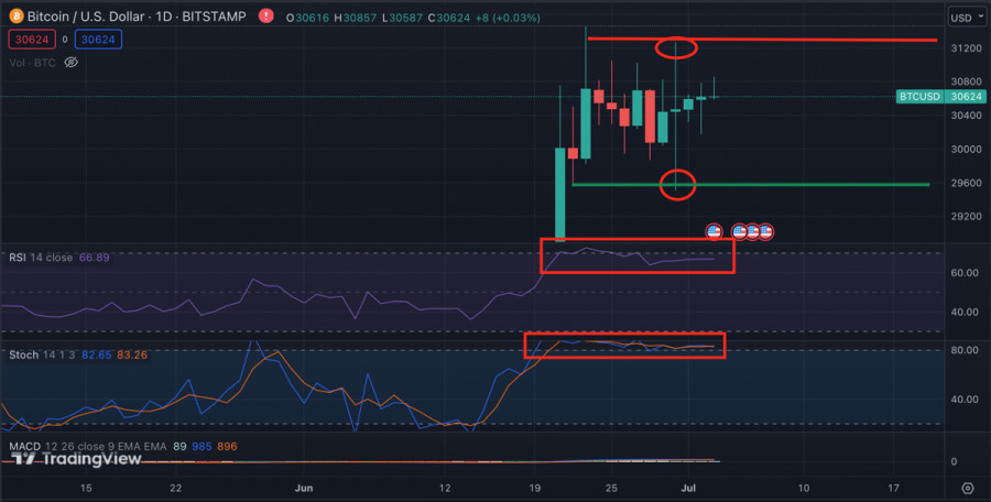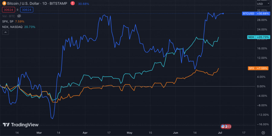 Июль – исторически бычий месяц для Биткоина: стоит ли ждать новых ценовых максимумов?ИнстаФорекс - Instaforex, 2 года назад Восходящий импульс Биткоина позволил активу перейти в новый диапазон активной торговли – $29,8k-$31,5k. Впоследствии покупательские объемы на рынке BTC упали, и актив завершил рабочую неделю при минимальных ценовых колебаниях. То же самое касается выходных дней, что в очередной раз подчеркивает важность рынка США для роста BTC. Биткоин завершил июнь на бычьей ноте, выше уровня $28k, что является позитивным сигналом для инвесторов продолжать покупать криптовалюту. Если смотреть в историческом разрезе, то июль в большинстве случаев оказывался бычьим месяцем для BTC. Однако каждый торговый месяц и год уникальны, а потому нельзя полагаться исключительно на исторический контекст. Фундаментальные факторыПолитика ФРС в отношении процентной ставки и уровень инфляции продолжают оставаться основными законодателями мод на крипторынке. В следующую среду состоится публикация отчетности по инфляции. На этой неделе рынки ожидает встряска вследствие публикации ключевых данных по рынку труда. Также на этой неделе появится подробный протокол заседания ФРС, где ожидается увидеть предпосылки к будущим действиям ведомства. Большинство инвесторов ожидают увидеть позицию других членов ФРС касательно возобновления повышения ставки в июле. Более 75% инвесторов на СМЕ ожидают повышение показателя в июле. Все эти данные могут оказать как положительное, так и негативное влияние на котировки Биткоина. Как сообщает К33 Research, котировки BTCUSD показывают рост преимущественно во время американской торговой сессии из-за активности институциональных инвесторов. Поэтому пока на рынке криптовалют не будут фиксироваться крупные перемещения объемов стейблкоинов, американские финрынки всегда должны оставаться во внимании инвесторов. Биткоин готовится к росту?Биткоин существенно нарастил бычий потенциал в июне благодаря росту уникального числа адресов и объемов торгов в сети актива. Совокупность этих факторов привела к тому, что пользователи сети BTC провели операций на 11,82 миллиона транзакций в июне. Это указывает на активизацию инвесторов и растущий интерес к BTC. Еще раз отметим, что если брать статистику с 2009 года, то июль является самым бычьим месяцем для Биткоина. При этом Kaiko сообщает о значительном снижении уровня корреляции между акциями США и BTC, что также может негативно сказаться на покупательских объемах на крипто рынке. Несмотря на это, в целом Биткоин успешно пережил локальную фиксацию прибыли, удержал уровень $30k и остается в рамках бычьего тренда. Учитывая это, в ближайшее время стоит ожидать повторные попытки актива закрепиться выше $31k. Значительная активизация торговой активности ожидается во второй половине дня. Технический анализ BTCUSDПосле волатильной пятницы, когда Биткоин протестировал верхнюю и нижнюю границы текущего диапазона колебаний $29,8k-$31,2k, на рынке воцарилась тишина. Объемы торгов упали до минимума и по состоянию на 14:00 восстановились лишь до $10 миллиардов. Основными целями для быков остаются уровни $31k-$31,3k, где сосредоточен большой ордер блок. При этом технические метрики на 1D таймфрейме остаются в зоне перекупленности. Это говорит о возможности локального снижения ниже уровня $29,8k, что вполне осуществимо в случ