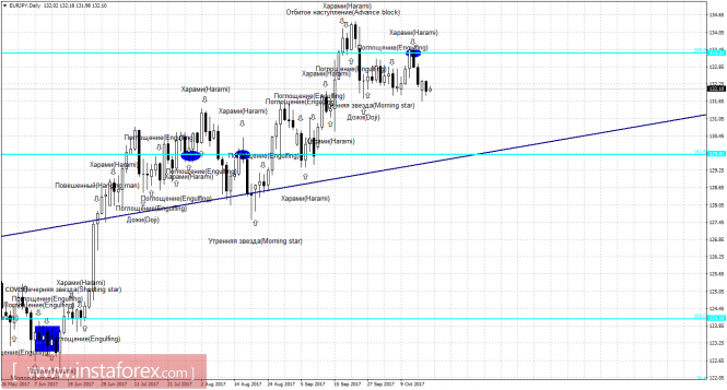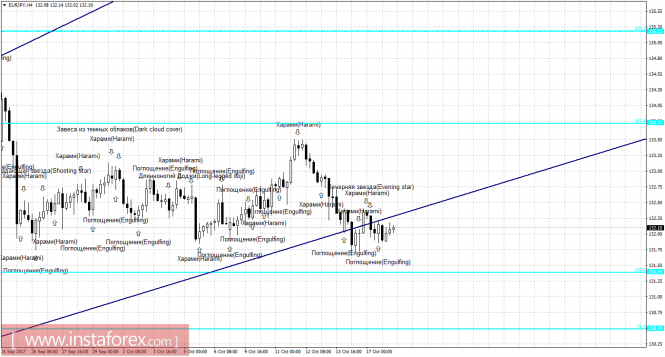 Свечной анализ EUR/JPY на 18 октябряИнстаФорекс - Instaforex, 8 лет назад 4h Медвежья формация «Вечерняя звезда» и бычья «Поглощение» никакого влияния на движение пары EUR/JPY не оказали. Падение котировок в итоге может быть продолжено в направлении коррекционного уровня 100,0% - 131,40 18 октября. Образование новой бычьей формации позволит трейдерам рассчитывать на разворот в пользу валюты ЕС и некоторый рост в направлении уровня коррекции 161,8% - 133,77. Образование медвежьей формации сработает в пользу дальнейшего падения. Закрепление курса под уровнем Фибо 100,0% повысит шансы пары на продолжение падения. Сетка Фибо построена по экстремумам от 2 августа 2017 года и 18 августа 2017 года. Daily На 24-часовом графике падение котировок продолжается в направлении уровня Фибо 161,8% - 129,81. Образование бычьей свечной формации позволит трейдерам рассчитывать на разворот в пользу евровалюты и возврат к уровню коррекции 200,0%. Такая формация будет трактоваться как трендовая, исходя из направления равноудаленного канала «вверх». Закрепление курса пары над уровнем Фибо 200,0% повысит вероятность дальнейшего роста в направлении следующего коррекционного уровня 261,8% - 139,01. Сетка Фибо построена по экстремумам от 15 декабря 2016 года и 17 апреля 2017 года. Материал предоставлен компанией InstaForex - www.instaforex.com |