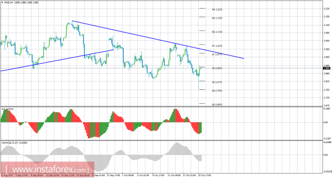 Технический анализ природного газа за 20 октября 2017 годаИнстаФорекс - Instaforex, 8 лет назад 4-часовой таймфрейм Анализ: Цена на природный газ начала восходящую коррекцию после того, как не сумела преодолеть уровень поддержки S3 – 2,8170. Цена отработала уровень 2,8970, но и его преодолеть не смогла, поэтому сейчас возможно возобновление нисходящего тренда с целями уровни поддержки 2,8170 и 2,7670. Оба индикатора развернулись наверх, сигнализируя о движении вверх. Нисходящая линия тренда перестроена и теперь вновь поддерживает торгующих на понижение и делать актуальными ордера на продажу. Запасы газа, по данным Министерства Энергетики США, увеличились, но меньше, чем ожидалось. Торговые рекомендации: По инструменту #NG сейчас рекомендуется рассматривать шорты с целями 2,8170 и 2,7670. Стоп-лосс выставляется выше ближайшего уровня сопротивления. Рекомендуется выставить Stop Loss в зону безубытка при прибыльности сделки 800-1000 пунктов. Закрытие выше уровня 2,8970 будет означать продолжение коррекции. Сегодня не ожидается никаких новостей, касающихся природного газа. Длинные позиции уже не актуальны. Помимо технической картины следует также учитывать фундаментальные данные и время их выхода. Пояснения к иллюстрациям: Awesome Oscillator – красные и зеленые бары в окне индикаторов. OsMA – серые бары в окне индикаторов. Линии тренда – синие линии. Уровни поддержки и сопротивления – красные горизонтальные линии.Материал предоставлен компанией InstaForex - www.instaforex.com |