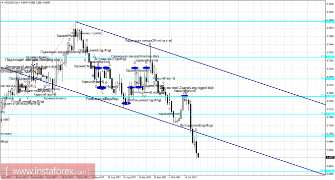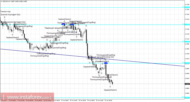 Свечной анализ NZD/USD на 25 октябряИнстаФорекс - Instaforex, 8 лет назад 4h Отбой котировок пары NZD/USD на 4-часовом графике и образование сильной медвежьей формации «Поглощение» позволили паре выполнить разворот в пользу доллара США и возобновить процесс падения в направлении уровня Фибо 100,0% - 0,6817. Новая медвежья формация «Харами» повышает шансы на продолжение падения. Отбой курса 25 октября от уровня коррекции 100,0% позволит рассчитывать на разворот в пользу валюты Новой Зеландии и некоторый рост в направлении коррекционного уровня 76,4% - 0,6993. Образование бычьей формации аналогично сработает в пользу начала роста. Сетка Фибо построена по экстремумам от 11 мая 2017 года и 27 июля 2017 года. Daily После образования на 24-часовом графике новой и сильной медвежьей свечной формации «Поглощение» котировки продолжили процесс падения в направлении коррекционного уровня 100,0% - 0,6818. Образование бычьей формации позволит ожидать разворот пары в пользу новозеландской валюты и некоторый рост в направлении уровня Фибо 76,4% - 0,6992. Отбой котировок от уровня коррекции 100,0% аналогично сработает в пользу начала роста пары. А закрепление под уровнем Фибо 100,0% повысит шансы на дальнейшее падение котировок. Сетка Фибо построена по экстремумам от 11 мая 2017 года и 27 июля 2017 года. Материал предоставлен компанией InstaForex - www.instaforex.com |