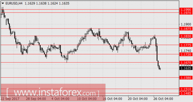 Итак, ЕЦБ не стал обманывать рынки и сделал то, что от него ожидалось – объявил о сокращении покупок активов с 60 до 30 млрд евро в месяц с продлением программы до сентября будущего года. Процентная ставка будет оставаться низкой ещё продолжительное время после завершения всей программы QE. Ну а так как в значительной степени рынки были готовы к такому решению и новость по ставке усилила расхождение в монетарной политики с ФРС, евро обвалился на 160 пунктов. Последовавший за ним фунт стерлингов потерял 100 пунктов. Индекс потребительского климата в Германии от GfK за ноябрь снизился с 10,8 до 10,7 при ожидании индикатора без изменения. Баланс розничных продаж в Великобритании от CBI за октябрь сокрушительно обрушился с 42 до -36, и это наихудшее значение с марта 2009 года. Вышедшие американские показатели по торговому балансу, оптовым запасам и незавершённым продажам на вторичном рынке жилья чуть хуже ожиданий уже не повлияли на принятое инвесторами решение. Не повлияла и новость, что ФРБ Атланты понизил прогноз по ВВП США на 3-й квартал с 2,7% до 2,5%.