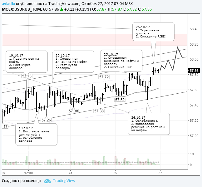 Два фактора усиления давления на рубльВладислав Антонов - Альпари, 8 лет назад В четверг, 26 октября, по итогам торговой сессии на Московской бирже курс американского доллара по расчётам «на завтра» повысился на 11 коп. (+0,19%), до 57,85 руб., курс евро снизился на 81 коп. (-1,20%), до 67,40 руб. Торговый объём в паре доллар/рубль составил $3,2 млрд (-0,84%), а в паре евро/рубль – 311,6 млн евро (+47,46%). Центральный банк России с 27 октября повысил официальный курс доллара США к рублю на 15,03 коп., до 57,7643 руб. Официальный курс евро к рублю был установлен на отметке 68,2890 руб., что выше предыдущего дня на 48,23 коп. Торги на внутреннем валютном рынке открылись смешанно по иностранным валютам. Рубль укрепился к доллару при отсутствии роста нефтяных котировок. Вероятно, это была запоздалая реакция на повышение цен на нефть в среду с $57,83 до $58,46 за баррель, а ослабление американской валюты на рынке форекс дополнительно стимулировало трейдеров покупать рубль на открытии. Волатильность по рублёвым парам была высокая. По итогам торгов рубль всё-таки подешевел к доллару, но значительно укрепился к единой валюте. «Евробыков» разочаровал исход заседания ЕЦБ. Совет управляющих Европейского Центробанка в четверг, по итогам заседания, сохранил все три ставки на прежних уровнях и продлил программу QE до сентября 2018 года. Выкуп активов в размере 60 млрд евро сохранится до конца нынешнего года. С нового года объем уменьшится на 30 млрд в месяц. Глава европейского регулятора Марио Драги в своем выступлении заявил, что при ухудшении экономической ситуации в еврозоне объем QE вновь увеличится. Пара евро/рубль упала на 1,2%, до 67,40 руб. Курс доллара при достижении уровня 57,48 руб. резко отскочил до 57,75 руб. Есть два фактора, которые усилили давление на российскую валюту. Первый – это ускорение роста курса доллара на сообщении, что палата представителей Конгресса США в четверг приняла проект федерального бюджета на 2018 год. Второй – продажи ОФЗ. Индекс государственных облигаций России (RGBI) снизился на 0,04%, до 140,37. В пятницу, 27 октября, ожидаю продолжения роста курса доллара до 58,16 руб. В четверг валютный рынок проигнорировал рост нефтяных котировок до $59,52 за баррель. Нефть подорожала на заявлениях наследного принца Саудовской Аравии Мухаммеда ибн Салман Аль Сауда о возможном продлении сделки ОПЕК+. Цена торгуется вблизи максимума $59,47 от 26 сентября 2017. Если покупатели смогут его пройти, то рост котировок на сорт Brent продолжится до уровня $60,75 за баррель. На рубле рост нефтяных котировок вряд ли сегодня отразится. Полагаю, что фокус внимания трейдеров сместится с нефтяного рынка на долговой, а также на новости о новых санкциях США против России. Заседание ЦБ РФ не окажет влияния на динамику рублёвых пар, поэтому его игнорирую. При выходе цены из канала вверх, новыми целями станут 58,45 руб. и 58,65 руб. за «американца».