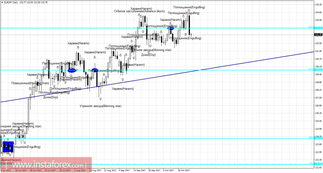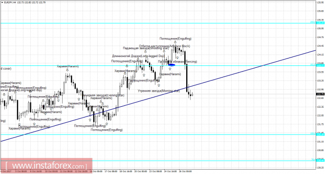 Свечной анализ EUR/JPY на 27 октябряИнстаФорекс - Instaforex, 8 лет назад 4h Пара EUR/JPY выполнила разворот в пользу валюты Японии без образования медвежьей свечной формации и закрепление под коррекционным уровнем 161,8% - 133,77. В итоге падение котировок может быть продолжено 27 октября в направлении следующего уровня коррекции 100,0% - 131,39. Образование бычьей свечной формации позволит рассчитывать на разворот в пользу валюты ЕС и некоторый рост в направлении уровня Фибо 161,8%. Равноудаленный канал уже не является рабочим, так как пара покинула его пределы уже во второй раз. Сетка Фибо построена по экстремумам от 2 августа 2017 года и 18 августа 2017 года. Daily Медвежья свечная формация «Поглощение», образовавшаяся на 24-часовом графике, позволила паре выполнить разворот в пользу валюты Японии и закрепление под уровнем коррекции 200,0% - 133,31. Таким образом, процесс падения может быть продолжен в направлении следующего уровня Фибо 161,8% - 129,81. Образование бычьей формации позволит трейдерам ожидать разворот в пользу евровалюты и возврат котировок к уровню коррекции 200,0%. Закрепление курса пары над уровнем Фибо 200,0% сработает в пользу дальнейшего роста в направлении следующего уровня коррекции 261,8% - 139,01. Сетка Фибо построена по экстремумам от 15 декабря 2016 года и 17 апреля 2017 года. Материал предоставлен компанией InstaForex - www.instaforex.com |