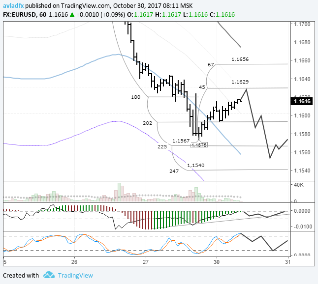 EURUSD: цель 1,1555Владислав Антонов - Альпари, 8 лет назад Итоги минувшего торгового дня: В пятницу, 27 октября, торги по паре евро/доллар закрылись в минусе. Евробыки удерживали уровень 1,1620 до последнего момента. Давление на них усилилось после публикации сильных данных по ВВП в США за 3 квартал. Показатель составил 3% против прогноза 2,5%. На новостях курс евро упал до 1,1580. Дополнительное давление на покупателей исходило от новостей из Каталонии. Парламент страны проголосовал за провозглашение независимости региона. Решение способствовало снижению доходности немецких облигаций и повышению курса золота. Потом стало известно, что премьер-министр Испании М. Рахой применил 155-ю статью Конституции страны и отправил в отставку правительство Каталонии. Должностей лишились президент автономии Карлес Пучдемон и все министры. Правительство Каталонии отказалось уходить в отставку. Курс евро пытался восстановиться, но коррекция началась лишь с минимума 1,1575, которую вызвало снижение доходности 10-летних американских облигаций. Она снизилась на новости, что фаворитом на пост председателя ФРС США является один из управляющих Федрезерва Пауэлл, который выступает за более мягкую денежно-кредитную политику. Запланированная статистика (GMT +3): В 10:00 Германия заявит об изменении объема розничной торговли за сентябрь. В 11:00 Швейцария опубликует индекс ведущих экономических индикаторов от KOF за октябрь. В 12:30 Британия отчитается по объему изменения M4, изменению одобренных заявок на ипотечные кредиты, а также объема потребительского кредитования за сентябрь. В 12:00 еврозона представит индекс настроений в экономике, индекс уверенности потребителей, индекс делового оптимизма в промышленности, и индекс настроения в деловых кругах за октябрь. В 15:30 США выпустит базовый индекс цен расходов на личное потребление, а также сообщит об изменении личных расходов и доходов населения за сентябрь. В 16:00 Германия представит индекс потребительских цен за октябрь.