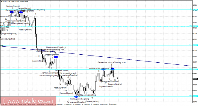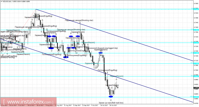 Свечной анализ NZD/USD на 6 ноябряИнстаФорекс - Instaforex, 8 лет назад 4h Отбой котировок от уровня коррекции 161,8% - 0,6937 и медвежья формация «Падающая звезда» позволили паре NZD/USD на 4-часовом графике выполнить разворот в пользу американской валюты и начать процесс падения в направлении уровня Фибо 200,0% - 0,6820. Образование 6 ноября бычьей формации будет трактоваться как коррекционный сигнал, и позволит трейдерам рассчитывать на разворот в пользу валюты Новой Зеландии и возврат котировок к уровню коррекции 161,8%. Закрепление пары над уровнем Фибо 161,8% повысит вероятность продолжения роста в направлении коррекционного уровня 127,2% - 0,7043. Сетка Фибо построена по экстремумам от 31 августа 2017 года и 20 сентября 2017 года. Daily На 24-часовом графике медвежья формация «Харами» позволила котировкам выполнить разворот в пользу доллара США и начать падение в направлении коррекционного уровня 100,0% - 0,6818. Образование бычьей формации будет идентифицировано как коррекционный сигнал, так как равноудаленный канал имеет направление «вниз», и позволит рассчитывать на возобновление роста в направлении уровня коррекции 76,4% - 0,6992. Закрепление курса пары под уровнем Фибо 100,0% сработает в пользу дальнейшего падения в направлении следующего уровня коррекции 127,2% - 0,6618. Сетка Фибо построена по экстремумам от 11 мая 2017 года и 27 июля 2017 года. Материал предоставлен компанией InstaForex - www.instaforex.com |