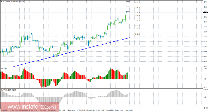 Технический анализ сырой нефти за 6 ноября 2017 годаИнстаФорекс - Instaforex, 8 лет назад 4-часовой таймфрейм Анализ: Котировки «черного золота» продолжают уверенное движение вверх, но в начале новой недели еще не успели преодолеть уровень сопротивления R1. Если этот таргет будет преодолен, то целями для восходящего движения будут выступать уровни сопротивления 56,70 и 57,47. Восходящая линия тренда продолжает поддерживать торгующих на повышение и делать актуальными ордера на покупку. Отчет Baker Hughes по количеству действующих нефтяных платформ в Штатах показал сокращение их общего количества на внушительные 8 единиц. Это и спровоцировало новый виток роста котировок нефти всех сортов. Торговые рекомендации: В ходе проведенного анализа движения цены на нефть, можно сделать вывод, что сейчас можно рассматривать ордера на покупку с целями 56,70 и 57,47. Стоп-лосс выставляем ниже ближайшего уровня поддержки. При заходе сделки в прибыльность 80-130 пунктов, рекомендуется переносить открытую сделку в безубыток. Закрепление цены выше 55,94 может указать на продолжение движения вверх. В понедельник ожидается никаких новостей касающихся нефти. Короткие позиции сейчас не актуальны. Помимо технической картины следует также учитывать фундаментальные данные и время их выхода. Пояснения к иллюстрациям: Awesome Oscillator – красные и зеленые бары в окне индикаторов. OsMA – серые бары в окне индикаторов. Линии тренда – синие линии. Уровни поддержки и сопротивления – красные горизонтальные линии.Материал предоставлен компанией InstaForex - www.instaforex.com |