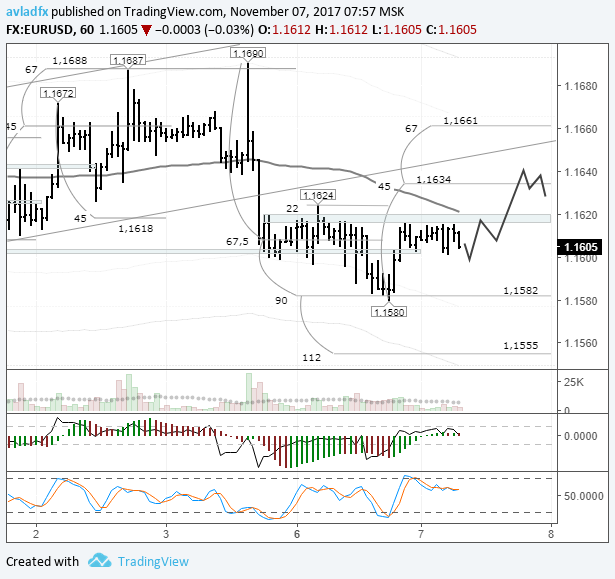 EURUSD: коррекция до 1,1640 остаётся в силеВладислав Антонов - Альпари, 8 лет назад Итоги минувшего торгового дня: В понедельник, 6 ноября, пара евро/доллар закрылась в двух пунктах от пятничного закрытия, оставив на дневной свече длинную тень на минимуме 1,1580. На торгах в Европе курс евро снижался до 1,1580. Драйверами для снижения стали комментарии главы Банка Англии Марка Карни и снижение доходности облигаций США с кроссами по евро. На американской сессии курс евро за три часа восстановился с 1,1580 до 1,1616 (+36 п.). Поводом для отскока могла стать новость, что глава ФРБ Нью-Йорка Уильям Дадли планирует уйти в отставку с данного поста в середине 2018 года. Фьючерс на ставку от FedWatch от CME Group отражает 97%-ю вероятность повышения ставки ФРС в декабре. Запланированная статистика (GMT +3): В 10:00 Германия отчитается по изменению промышленного производства за сентябрь. В 11:00 Швейцария сообщит об изменении резервов НБШ в иностранной валюте за октябрь. В 11:30 в Британии выйдет индекс цен на жилье от Halifax за октябрь. В 12:00 с речью выступит глава ЕЦБ Марио Драги В 13:00 еврозона опубликует данные об изменении розничных продаж за сентябрь. В 17:30 с речью выступит член исполнительного совета ЕЦБ Сабине Лаутеншлегер. В 18:00 США сообщит об изменении уровня вакансий и текучести рабочей силы за сентябрь. В 20:35 с речью выступит член FOMC Рандал Кварлс. В 20:55 с речью выступит глава Банка Канады Стивен Полоз. В 22:30 мск с речью выступит глава ФРС США Дж.Йеллен.
