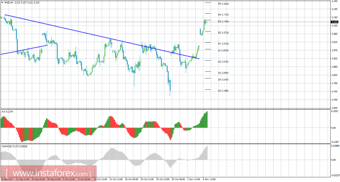 Технический анализ природного газа за 7 ноября 2017 годаИнстаФорекс - Instaforex, 8 лет назад 4-часовой таймфрейм Анализ: Цена на природный газ в понедельник, 6 ноября, продолжила восходящее движение после того, как открыла новую неделю с сильного гэпа вверх. Отработан уровень сопротивления R3, и преодолеть с первой попытки цена его не смогла. Отскок цены от этого таргета может спровоцировать виток нисходящей коррекции с целями уровня 3,0730 и 3,0130. Оба индикатора продолжают сигнализировать о восходящей тенденции, но могут начать разряжаться, так как находятся на своих максимальных позициях. Торговые рекомендации: По инструменту #NG сейчас рекомендуется рассматривать лонги с целями 3,1720 и 3,2320. Стоп-лосс выставляется ниже ближайшего уровня поддержки. Рекомендуется выставить Stop Loss в зону безубытка при прибыльности сделки 800-1000 пунктов. Закрепление цены выше уровня 3,1340 будет означать продолжение движения вверх. На сегодня нет запланированных новостей, касающихся газа. Ордера на продажу сейчас не актуальны. Помимо технической картины следует также учитывать фундаментальные данные и время их выхода. Пояснения к иллюстрациям: Awesome Oscillator – красные и зеленые бары в окне индикаторов. OsMA – серые бары в окне индикаторов. Линии тренда – синие линии. Уровни поддержки и сопротивления – красные горизонтальные линии.Материал предоставлен компанией InstaForex - www.instaforex.com |