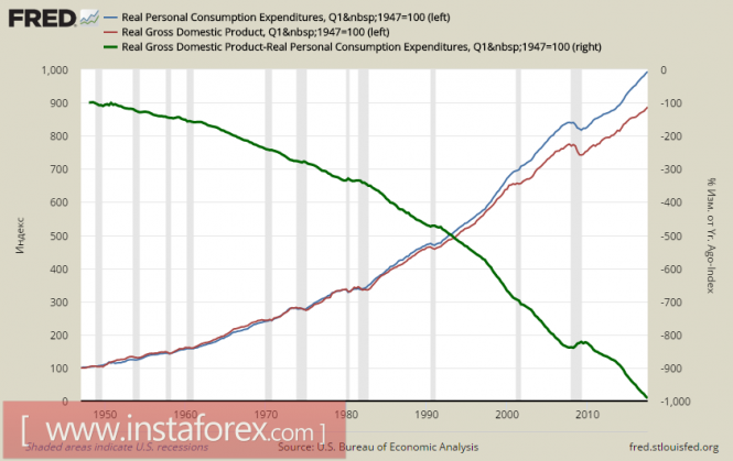 Насколько устойчив спрос на доллар?ИнстаФорекс - Instaforex, 8 лет назад Доллар начал неделю нейтрально, растеряв весь накопленный ранее энтузиазм. Отчасти это объясняется тем, что отыграны все основные драйверы, которые двигали его в последнее время – состоялось представление нового главы ФРС, в Конгресс подан план по налоговой реформе, темпы роста ставок ФРС на последнем заседании подтверждены. ФРС движется к своим целям быстрее любого другого центробанка, темпы повышения ставок довольно высокие, особенно на фоне слабой инфляции, к тому же начата программа сокращения баланса, которая может спровоцировать кризис ликвидности. Спрос на доллар устойчиво растет, это прямое следствие ожиданий по темпам нормализации монетарной политики. Динамика спроса на доллар хорошо отслеживается по отчетам CFTC. Спекулятивный спрос против 10 основных валют, отслеживаемых биржей, начал рост в середине 2016 года и достиг максимума на волне эйфории от победы Трампа к концу декабря, после чего последовало затяжное падение. Нижняя точка была достигнута в конце августа, и даже более слабые, чем ожидалось, итоги заседания ФРС в сентябре не смогли помешать развороту в настроениях инвесторов. На данный момент уже несколько недель подряд спрос на доллар активно растет, и можно предполагать, что дно сформировано. Таким образом, можно отметить нарастающий интерес к американским активам. Инвесторы исходят из того, что экономика США является локомотивом всей мировой экономики, и высокие темпы экономического роста делают активы более привлекательными. Низкая инфляция? Это явление временное, по уверениям ФРС, которая ожидает реализации на практике ключевого положения современной экономической теории, известной как «правило Филипса». Согласно этому утверждению, инфляция всегда есть следствие состояния рынка труда. При полной занятости, а именно сейчас в США безработица достигла минимума 4.1%, рост заработной платы растет опережающими темпами, что в итоге приводит и к росту потребительского спроса и к росту инфляции, нужно всего лишь немного подождать. Конечно, это положение звучит довольно убедительно, особенно если учесть, что руководство FOMC на своих заседаниях во время дискуссии по монетарной политике постоянно вспоминают это правило. Но давайте посмотрим на ситуацию с другой стороны. На графике ниже – темпы роста ВВП США в сравнении с темпами роста потребительских расходов. Оба индекса уверенно растут с 1947 года, замедляясь в периоды рецессий, но темпы роста расходов на всём временном промежутке опережают темпы роста ВВП. Другими словами, потребительский рост в США имеет в своей основе вовсе не рост экономики, а, очевидно, рост кредитования. Граждане США обеспечивают опережающий рост расходов не потому, что у них высокими темпами растет заработная плата, поскольку она не может расти быстрее экономики в целом, а потому, что темпы роста потребительского кредитования еще выше. Таким образом, экономика США, если она рассматривается изолированно от всего мира, неэффективна – её рост не соответствует росту потребления. Как в таких условиях ожидать роста инфляции, которая, в свою очередь, должна опираться на еще более высокие темпы роста потребления? Дефляция в текущих условиях – процесс совершенно естественный, и даже полная занятость не способна заметно 