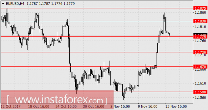Европейская единая валюта вчера продолжила активно расти и вошла в диапазон 1.1830/75, чему помог вышедший лучше прогноза сентябрьский торговый баланс еврозоны: 25,0 млрд евро против ожидания 21,2 млрд и 21,0 млрд евро в августе. Но также быстро цена вернулась к исходным позициям, и в итоге евро закрыл день снижением на 6 пунктов. Это является ответом на наш вчерашний вопрос о времени завершения коррекции – коррекция завершилась вчера.