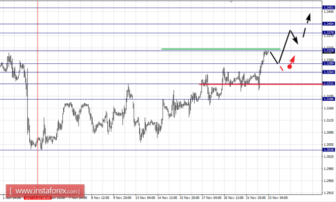 Фрактальный анализ по основным валютным парам на 23 ноябряИнстаФорекс - Instaforex, 7 лет назад Здравствуйте, уважаемые коллеги. По паре Евро/Доллар, цена формирует локальную восходящую структуру от 21 ноября. По паре Фунт/Доллар потенциал для восходящего цикла находится на отметке 1.3451, продолжения движения кверху ожидаем после пробоя 1.3330. По паре Доллар/Франк цена возобновила движение нисходящего цикла от 1 ноября. По паре Доллар/Иена цена близка к предельным значениям для нисходящего движения – 110.75. По паре Евро/Иена следим за формированием нисходящей структуры от 14 ноября. По паре Фунт/Иена выраженного движения книзу ожидаем после пробоя 147.40, движение кверху рассматриваем в качестве коррекции. Прогноз на 23 ноября: Аналитический обзор валютных пар в масштабе Н1: