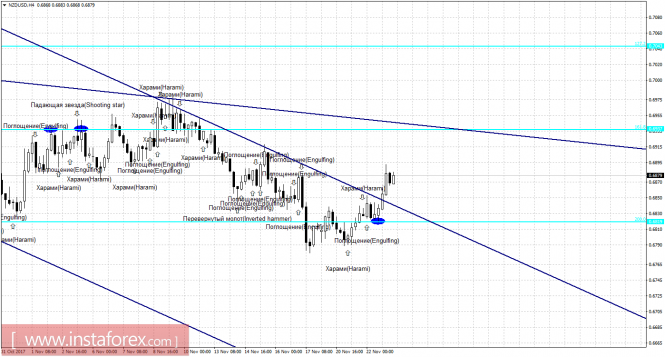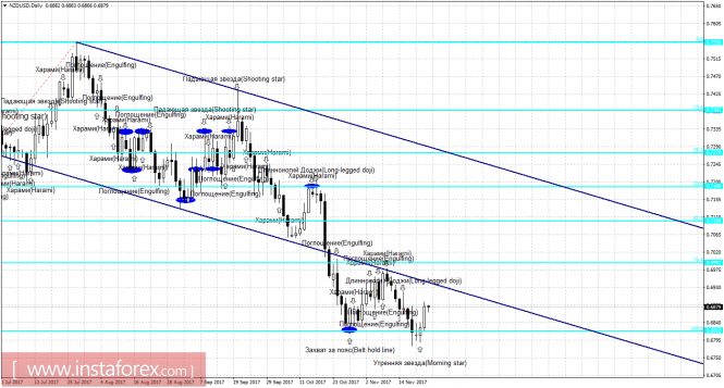 Свечной анализ NZD/USD на 23 ноябряИнстаФорекс - Instaforex, 7 лет назад 4h Пара NZD/USD на 4-часовом графике выполнила отбой от уровня коррекции 200,0% - 0,6821. Таким образом, рост котировок возобновился и может быть продолжен 23 ноября в направлении следующего уровня Фибо 161,8% - 0,6937. Образование медвежьей свечной формации позволит трейдерам ожидать разворот в пользу новозеландской валюты и некоторое падение котировок в направлении уровня Фибо 200,0%. Любая медвежья формация будет трактоваться как трендовая. Закрепление курса под уровнем коррекции 200,0% сработает в пользу дальнейшего падения в направлении следующего уровня Фибо 261,8% - 0,6630. Сетка Фибо построена по экстремумам от 31 августа 2017 года и 20 сентября 2017 года. Daily На 24-часовом графике бычья свечная формация «Утренняя звезда» позволила выполнить разворот в пользу валюты Новой Зеландии и начать процесс роста в направлении уровня коррекции 76,4% - 0,6992. Образование медвежьей формации будет трактоваться как трендовый сигнал и позволит ожидать разворот пары в пользу американской валюты и возврат котировок к уровню Фибо 100,0% - 0,6818. Закрепление котировок под уровнем Фибо 100,0% повысит вероятность дальнейшего падения в направлении следующего коррекционного уровня 127,2% - 0,6618. Сетка Фибо построена по экстремумам от 11 мая 2017 года и 27 июля 2017 года. Материал предоставлен компанией InstaForex - www.instaforex.com |