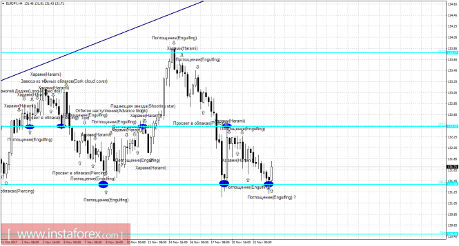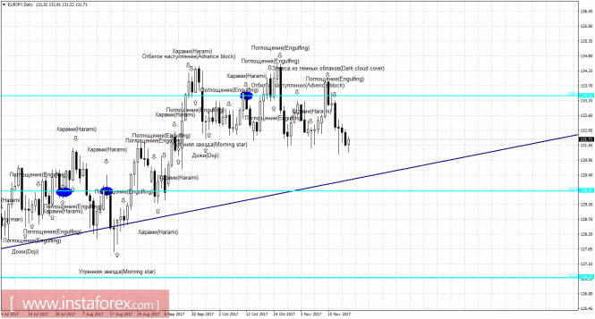 Свечной анализ EUR/JPY на 23 ноябряИнстаФорекс - Instaforex, 7 лет назад 4h Котировки пары EUR/JPY выполнили падение на 4-часовом графике к уровню коррекции 100,0% - 131,40, однако отбой от этого уровня Фибо позволил выполнить разворот в пользу европейской валюты и начать процесс роста в направлении коррекционного уровня 127,2% - 132,43. Образование 23 ноября бычьей формации повысит шансы пары на некоторый рост котировок. Закрепление пары под уровнем Фибо 100,0% повысит вероятность дальнейшего падения в направлении следующего уровня коррекции 76,4% - 130,49. Сетка Фибо построена по экстремумам от 2 августа 2017 года и 18 августа 2017 года. Daily На 24-часовом графике, после образования новой медвежьей формации «Поглощение», падение пары продолжается в направлении коррекционного уровня Фибо 161,8% - 129,81. Образование бычьей свечной формации будет трактоваться как трендовый сигнал, так как равноудаленный канал имеет направление «вверх», и позволит рассчитывать на разворот пары в пользу валюты ЕС и некоторый рост в направлении уровня коррекции 200,0% - 133,32. Закрепление курса пары над уровнем Фибо 200,0% сработает в пользу продолжения роста в направлении следующего коррекционного уровня 261,8% - 139,01. Сетка Фибо построена по экстремумам от 15 декабря 2016 года и 17 апреля 2017 года. Материал предоставлен компанией InstaForex - www.instaforex.com |