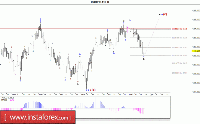 Волновой анализ валютной пары USD/JPY. Недельный обзорИнстаФорекс - Instaforex, 7 лет назад Анализ волновой разметки: Возобновив в минувший вторник нисходящее движение, пара USD/JPY потеряла около 160 б.п. и в пятницу остановилась перед уровнем 111-й фигуры. Складывающаяся при этом волновая ситуация позволяет рассматривать достигнутые в конце октября максимумы, в качестве вершины волны а в а, в составе начавшей усложнять свою волновую структуру, волны (С). Если это так, то практически у достигнутого в пятницу минимума, валютная пара может завершить волну b, в а, в (С) и начав рост котировок, перейти в стадию формирования волны с в а, в (С). Цели для варианта с построением нисходящей волны: 111,01 – 50,0% по Фибоначчи 110,14 – 61,8% по Фибоначчи Цели для варианта с построением восходящей волны: 115,43 – 61,8% по Фибоначчи 116,32 – 76,4% по Фибоначчи Общие выводы и торговые рекомендации: Пара USD/JPY продолжает построение повышательной волны (С). Таким образом, повышение котировок может возобновиться в рамках волны с, в а, в будущей (С) с целями, расположенными около расчетных отметок 115,43 и 116,32, что соответствует 61,8% и 76,4% по Фибоначчи (эти цели еще будут пересмотрены). Предполагаемая волна b продолжает свое построение с целями, находящимися около расчетных отметок 111,01 и 110,14, что приравнивается к 50,0% и 61,8% по Фибоначчи.Материал предоставлен компанией InstaForex - www.instaforex.com |