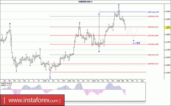Волновой анализ валютной пары EUR/USD за 29 ноября 2017 годаИнстаФорекс - Instaforex, 7 лет назад Анализ волновой разметки: Вчерашние торги пара EUR/USD начала с продолжения начавшегося накануне нисходящего движения и, потеряв в цене около 75 п.п., в конце дня достигла отметки 1,1825. Таким образом, похоже на то, что валютная пара подтверждает переход в стадию формирования первых образующих волн в составе будущей волны с, в а, в (С). Если это так, то в качестве первой расчетной цели для волны а, в с, в а, в (С) можно рассматривать уровень 18-й фигуры, или отметку 1,1770. Цели для построения нисходящей волны: 1,1736 - 38,2% по Фибоначчи 1,1666 – 23,6% по Фибоначчи Цели для построения восходящей волны: 1,1918 – 76,4% по Фибоначчи 1,1946 – 76,4% по Фибоначчи Общие выводы и торговые рекомендации: Продолжается построение понижательного участка тренда. Предполагаемая волна b, в а, в (С) завершила свое построение. Если это предположение верно, то снижение котировок продолжиться с целями, расположенными около расчетных отметок 1,1736 и 1,1666, что соответствует 38,2% и 23,6% по Фибоначчи в рамках предполагаемой волны а, в с, в а, в (С).Материал предоставлен компанией InstaForex - www.instaforex.com |