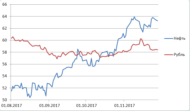 Прогноз курса доллара и евро к рублю до конца 2017 годаРоман Ткачук - Альпари, 7 лет назад Прогноз курса рубля на декабрь 2017 года В середине ноября доллар скакнул к 60,5 рублям, а евро — к 71. Российская валюта быстро восстановила позиции, но вопросы у рядовых россиян остались. Что же ждать от рубля до конца года? На мой взгляд, волноваться не стоит. Мы ожидаем, что в декабре курс рубля будет находится в диапазоне 58-60, сильного ослабления ожидать не стоит. Поясню свою точку зрения. Рис.1 Динамика нефти и рубля в августе-ноябре 2017 г.: