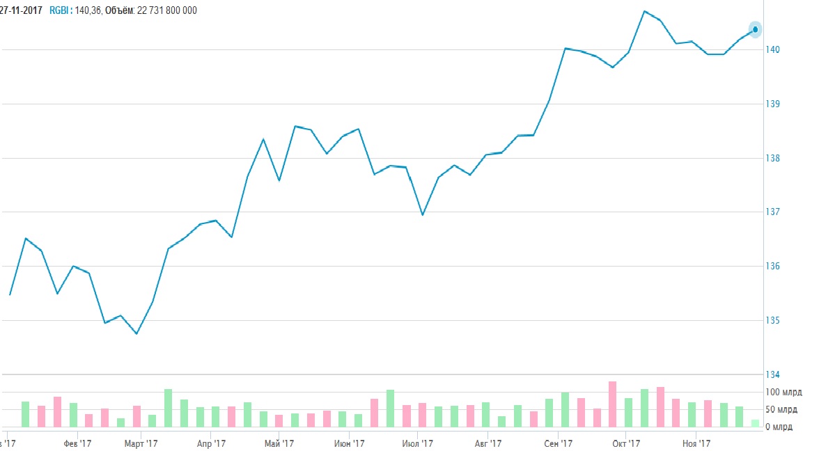 Ист.: Московская биржа Что ждать от нефти? Что касается корреляции с нефтяными котировками, то в конце октября — начале ноября она вдруг пропала. За пару недель стоимость нефти в рублях скакнула вверх на 15% до 3700 — до комфортных для российского бюджета уровней. Во второй половине ноября корреляция вернулась. Нефть росла на ожиданиях продления соглашения ОПЕК+ по сокращению добычи — рубль укреплялся. Продление соглашения — дело практически решенное, за него выступают Россия и Саудовская Аравия — крупнейшие нефтедобывающие страны. Для поддержания стабильных цен на нефть к ним примкнут и остальные. На заседании ОПЕК 30 ноября 2017 года будут обсуждаться детали (кто и насколько снизит добычу) и подпишут соответствующие протоколы. В ближайшие дни перед заседанием ОПЕК 30 ноября 2017 года котировки Brent затаятся на месте. После продления соглашения возможна коррекция нефтяных котировок вниз (традиционное «покупай на слухах — продавай на фактах») или продолжение плавного роста. В любом случае, для нефти актуальным останется широкий боковик на уровнях $60-70 — при этом наблюдается баланс спроса и предложения. Для рубля это поддерживающий фактор. Рубль и валюты развивающихся стран Второй момент — отношение инвесторов к валютам развивающихся стран. В последнее время они достаточно волатильны, что говорит о нервозности участников рынка. Под наибольшим давлением находится турецкая лира (она снижается уже 4 года, в этом году ослабла на 12%), но это скорее локальная история. Отметим, что крупнейшие американские инвестиционные банки J.P.Morgan b Goldman Sachs в своих вышедших недавно «Стратегиях на 2018 год» рекомендуют покупать развивающиеся рынки — это позитивный сигнал. Что касается экономики России, то в этом году она вернулась к росту и достаточно устойчива. Отношение инвесторов (в том числе, зарубежных) к рублю как к высокодоходной валюте умеренно-позитивное, не в последнюю очередь благодаря тому, что ставки в российской экономике держатся на высоком уровне. Отметим, что в глазах западных инвесторов среди других развивающихся стран бюджетная политика Центробанка одна из самых жестких, да и ключевая ставка существенно выше инфляции (у ЦБ развязаны руки для ее снижения) — это делает рубль и ОФЗ одними из фаворитов среди валют и облигаций развивающихся стран. Об отношении инвесторов к российским активам можно судить по динамике RGBI (Russian Government Bond Index) — индекса российских государственных облигаций. В середине ноября RGBI опустился до 139,5 — в тот момент наблюдался пониженный спрос на ОФЗ. Возможно, это было связано с опасениями введения новых санкций США в отношении России (главный риск — запрет на покупки российского долга). Но спустя всего две недели, спрос восстановился, а на последних размещениях ОФЗ Минфином вновь наблюдается переподписка в 3 раза. Рис.3 Динамика RGBI