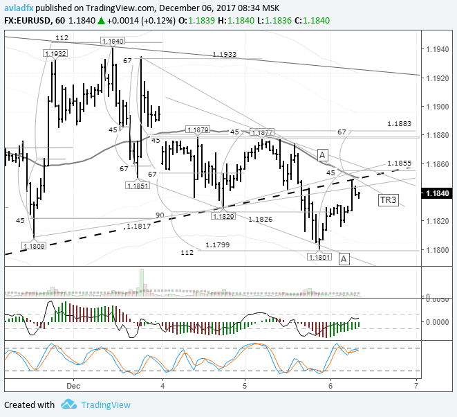 EURUSD: цена стоит под трендовой линиейВладислав Антонов - Альпари, 7 лет назад Итоги минувшего торгового дня: Во вторник, 5 ноября, торги по паре евро/доллар завершились снижением. Мне до сих пор неясно почему евро подешевел к доллару с 1,1874 до 1,1801. В это время доходность американских облигаций торговалась в минусе. На американской сессии её падение ускорилось. Деловая активность в сфере услуг в США в ноябре упала сильнее прогнозов. Остаются два фактора, которые могли заставить инвесторов и трейдеров покупать доллар и подавать евро. Первый, это принятие налоговой реформы обеими палаты Конгресса США. Второе, банковский комитет Сената проголосовал за кандидатуру Пауэлла на пост председателя ФРС США. Есть также мнение, что рынок раскачивают перед пятничным отчетом по американскому рынку труда. Во вторник торги по паре евро/доллар завершились на уровне 1,1824. Запланированная статистика (GMT +3): В 10:00 Германия отчитается по изменению объема производственных заказов за октябрь. В 16:15 США сообщит об изменении числа занятых от ADP за ноябрь. В 16:30 Канала объявит об изменении уровня производительности труда за 3-й квартал, а США - об изменение уровня производительности рабочей силы в непроизводственном секторе и уровня себестоимости труда за 3-й квартал. В 18:00 в Канаде будет оглашено решение Банка Канады по процентной ставке, а также выйдет Сопроводительное заявление Банка Канады. В 18:30 США заявят об изменении запасов нефти по данным министерства энергетики.