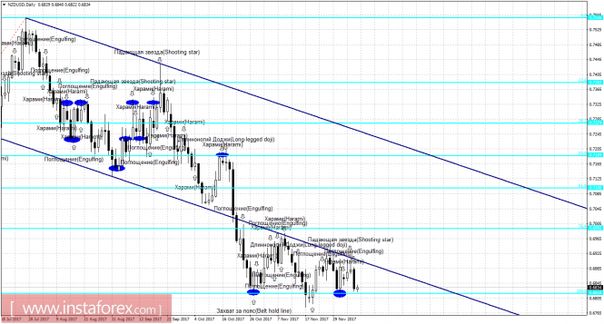 Свечной анализ NZD/USD на 8 декабряИнстаФорекс - Instaforex, 8 лет назад 4h Пара NZD/USD на 4-часовом графике продолжает процесс падения в направлении коррекционного уровня 200,0% - 0,6819, несмотря на образование двух бычьих формаций «Харами». Образование 8 декабря новой бычьей свечной формации позволит трейдерам ожидать разворот в пользу валюты Новой Зеландии и некоторый рост в направлении уровня коррекции 161,8% - 0,6937. Отбой курса пары от уровня Фибо 200,0% аналогично позволит рассчитывать на некоторый рост котировок. Закрепление курса пары под уровнем Фибо 200,0% повысит вероятность продолжения падения котировок в направлении коррекционного уровня 261,8% - 0,6630. Сетка Фибо построена по экстремумам от 31 августа 2017 года и 20 сентября 2017 года. Daily На 24-часовом графике медвежья формация «Падающая звезда» и следующая за ней «Поглощение» позволили выполнить разворот в пользу валюты США и начать процесс возврата к уровню коррекции 100,0% - 0,6818. Отбой котировок от уровня Фибо 100,0% позволит рассчитывать на разворот в пользу новозеландской валюты и некоторый рост в направлении коррекционного уровня 76,4% - 0,6992. Образование бычьей формации аналогично сработает в пользу начала роста пары. Закрепление котировок под уровнем Фибо 100,0% повысит шансы на дальнейшее падение в направлении следующего уровня коррекции 127,2% - 0,6618. Сетка Фибо построена по экстремумам от 11 мая 2017 года и 27 июля 2017 года. Материал предоставлен компанией InstaForex - www.instaforex.com |