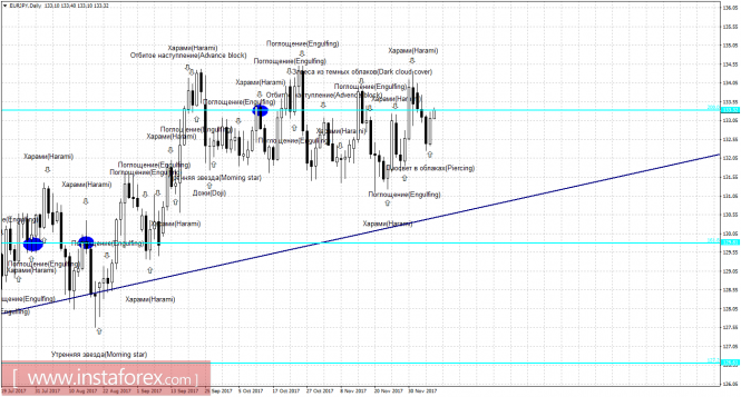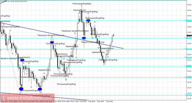 Свечной анализ EUR/JPY на 8 декабряИнстаФорекс - Instaforex, 8 лет назад 4h Без образования бычьей свечной формации котировки EUR/JPY выполнили разворот в пользу европейской валюты, а бычья формация «Поглощение» позволила паре продолжить рост и выполнить закрепление над уровнем коррекции 76,4% - 133,24. В итоге 8 декабря процесс роста пары может быть продолжен в направлении следующего коррекционного уровня 100,0% - 133,87. Образование медвежьей формации позволит трейдерам ожидать разворот в пользу валюты Японии и некоторое падение котировок. Закрепление пары под уровнем Фибо 76,4% повысит шансы на продолжение падения в направлении следующего уровня коррекции 61,8% - 132,84. Сетка Фибо построена по экстремумам от 15 ноября 2017 года и 20 ноября 2017 года. Daily На 24-часовом графике, после образования бычьей свечной формации «Просвет в облаках», пара выполнила разворот в пользу европейской валюты и осуществила возврат к уровню Фибо 200,0% - 133,32. Отбой котировок от уровня коррекции 200,0% позволит рассчитывать на разворот в пользу японской иены и возобновление падения в направлении уровня Фибо 161,8% - 129,81. Образование медвежьей формации повысит вероятность отбоя от уровня коррекции 200,0%. Закрепление пары над уровнем Фибо 200,0% повысит шансы на дальнейший рост. Сетка Фибо построена по экстремумам от 15 декабря 2016 года и 17 апреля 2017 года. Материал предоставлен компанией InstaForex - www.instaforex.com |