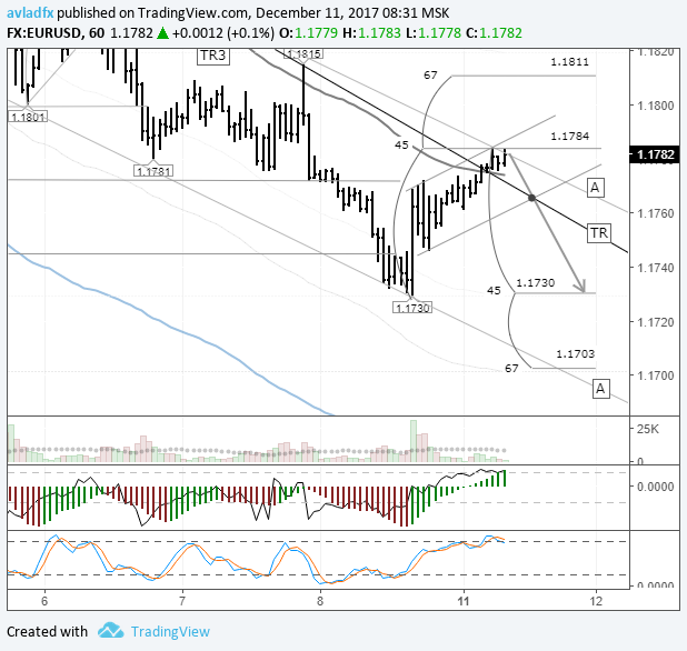 Рис. 1 Курс евро/доллар, часовой период. Источник данных: TradingView На момент написания обзора евро стоит 1,1784. Цена находится у верхней линии канала «А-А» на 45-м градусе. Через уровень 1,1774 проходит балансовая линия lb (sma 55). Учитывая расположение часовых индикаторов и пустой экономический календарь, на понедельник по прогнозу жду падение до 1,1730 (45 гр.). На данный момент ослабление евро ниже 45 градуса не рассматриваю, так как на дневном периоде сформировался пинбар, а осциллятор стохастик разворачивается вверх. Обратите внимание на другой важный момент. Пробита трендовая линия TR от 1,1935. Я её пока игнорирую из-за канала «А-А». Если цена отскочит от верхней границы, то зафиксируется её ложный пробой. В целом можно сходить до 1,1730 и ниже. Сейчас важно побыстрее вернуться под 1,1770. Комментарии по движению цены по прогнозу или его отмены, дам на канале в телеграм. В 11:00 (gmt +3) откроются торги в Лондоне. Желательно, чтобы они открылись снижением по евро. Снижение курса сдержит покупателей и повысит вероятность отбоя цены от верхней линии канала «А-А». В среду состоится заседание FOMC. Ожидается, что процентная ставка будет повышена на 0,25 процентных пункта. В Конгрессе достигнуты договоренности по вопросу финансирования правительства до 22 декабря. Президент США Трамп уже подписал этот закон. |