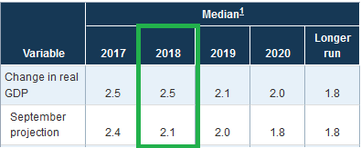 В таблице видно, что, по новым прогнозам ФРС, уровни ключевой процентной ставки в 2018-2019 годах не поменялись, а также не поменялся уровень «нейтральной процентной ставки» — 2,8% годовых. Единственное, на 25 б. п. повысилась прогнозная процентная ставка на 2020 год с 2,9% до 3,15%. Следовательно, можно сделать вывод, что ФРС очень незначительно ужесточила риторику по монетарной политике. По поводу экономического роста в США Федрезерв значительно улучшил свой прогноз по ВВП на 2018 год:
